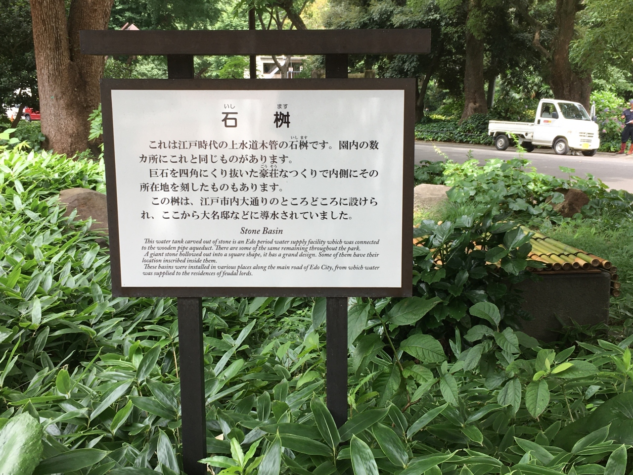石升は日比谷公園の中には数カ所あるそうで、これは大噴水の近くにあるものです。巨石を四角にくり抜いたつくりで、江戸市内大通りのところどころに設けられて、ここから大名屋敷などに導水されていたそうです。千代田区紀尾井町の清水谷公園の中にもあるようです。江戸は人口が多く、水不足で我が家の近くの玉川上水も造られ、ここから江戸まで水が来ていたそうです。江戸って凄い。