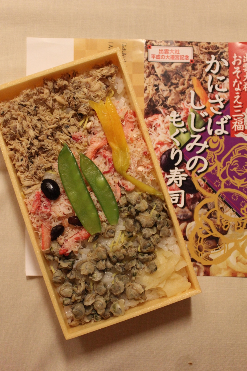 松江駅の駅弁業者で駅構内に駅弁売店を構えています。夜行列車のサンライズ出雲での夜食用に名物「かにさばしじみのもぐり寿司」を仕入れました。具がごはんに隠れてはおらず、ちらし寿司風でした。しじみは地元宍道湖の名物ですね。