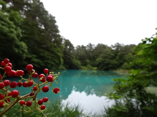 五色沼探勝路の中の中ほどにある沼で、色彩が青白く、ちょっと北海道大雪のにある青い池に似た感じの神秘的で美しい色合いです。