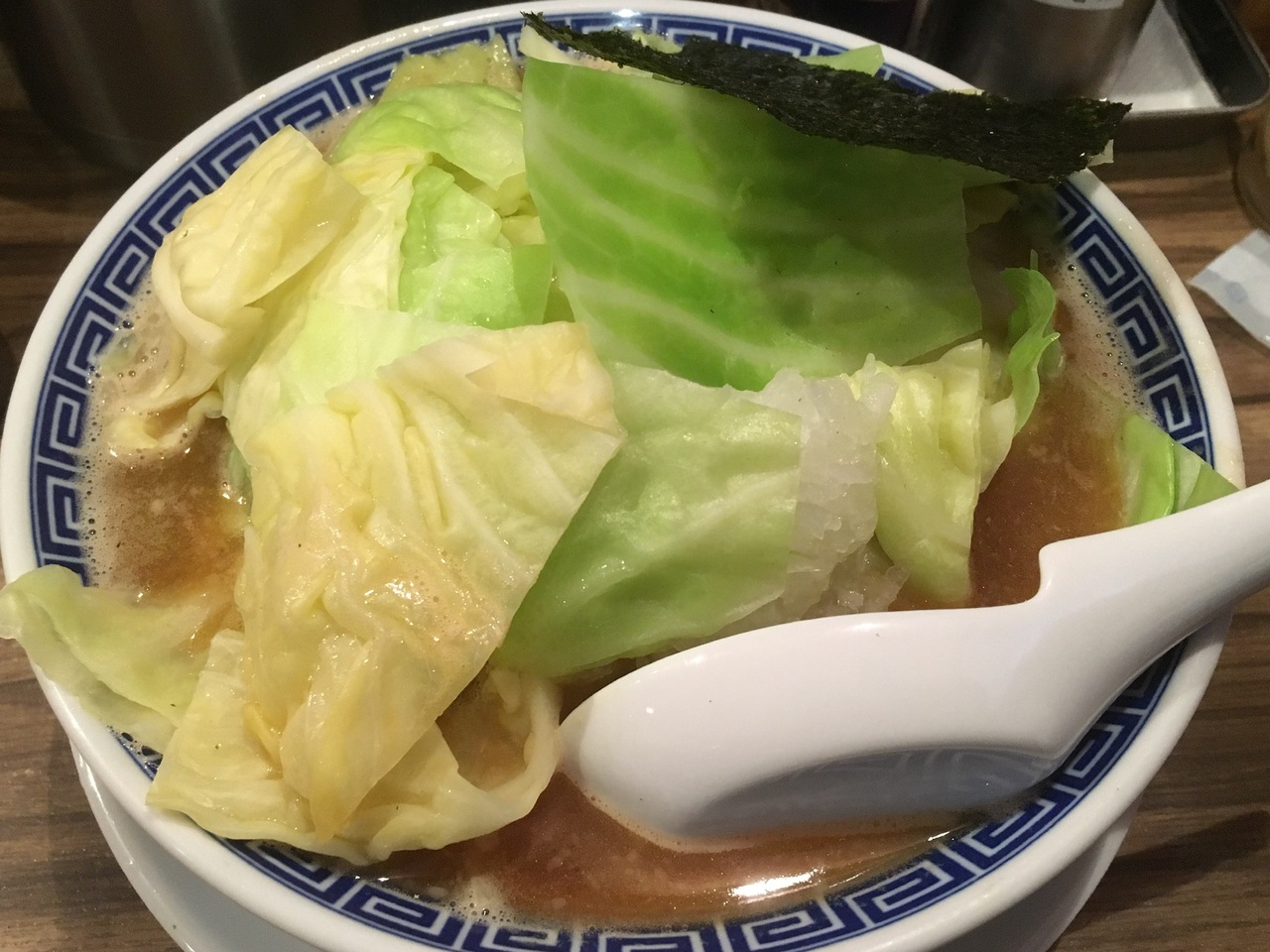 田無駅北口から3分ほど、ボリュームあるつけめんの人気店です。店内は狭くカウンターのみです。ラーメンをいただきました。どんぶりを覆うキャベツが特徴的でした。最近、店名がジァイアン弐から変わったようでした。