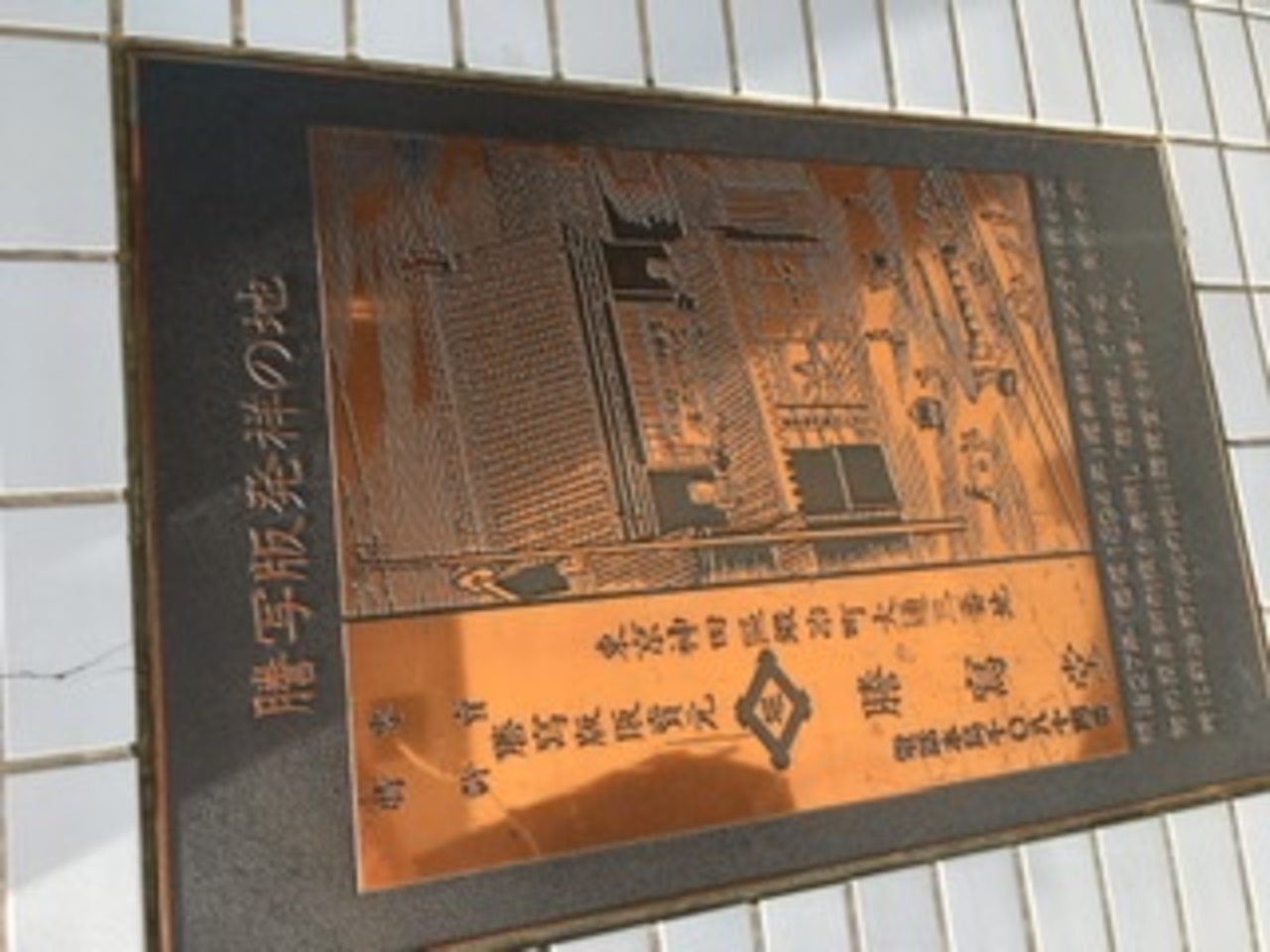 今の若い人だと分からない人が多いかも知れませんが、謄写版とは小中学校で頻繁に使っていたガリ版印刷のことです。JR山手線神田駅の東側で中央通りに面した神田中央通ビルの壁にありました。「謄写版発祥の地」と刻まれた 銅のプレートが埋め込まれており、常に大切に磨かれているのでしょうか、プレートの表面が黄金色に輝いていました。