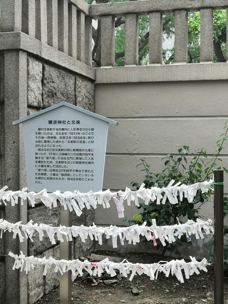朝の散歩で伺いましたが、駅からも近くロケーションは良好です。時間的に人もいなくてじっくりと見学ができました。歴史のある神社ということで、境内には文楽との繋がりが書かれた立て看板などがありました。落ち着いたいい場所です。