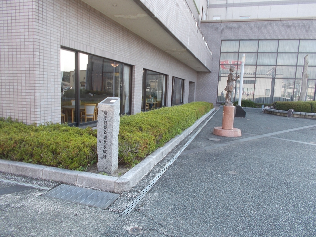 この岩手軽便鉄道花巻駅跡は花巻駅東口の駅前広場に面しています。今はその場所に石柱の碑がたてられたいます。この鉄道は大正時代に運行が行われました。花巻~東の買う願までを結ぶ計画でしたが仙人峠まででそのあとは敷設ができませんでした。今はJR東日本が釜石線として運行されています。人々が東へとの連絡を求めた路線です。