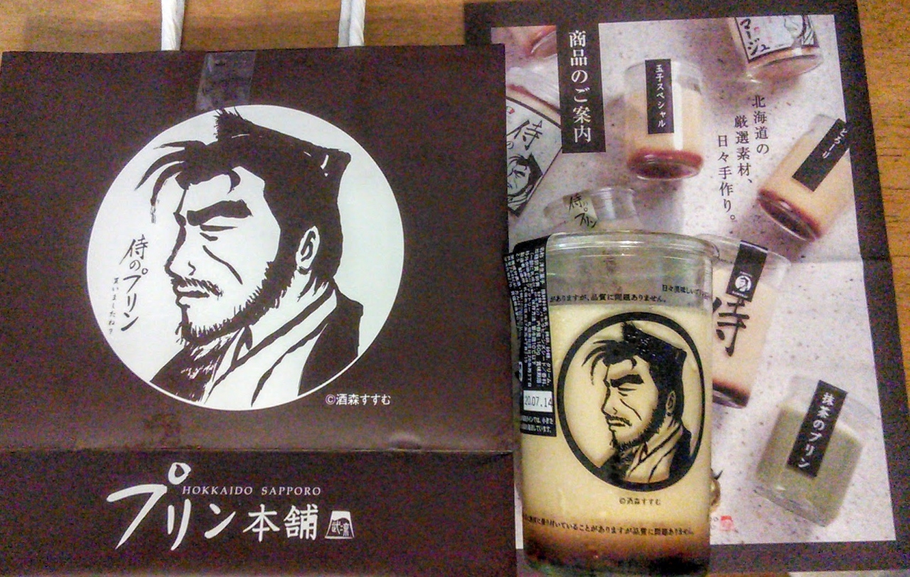 浪人風情の侍のイラストが目印になっている、サムライ御用達プリン専門店です。ワンカップ大関のようなガラス瓶入りで、イラストの侍の名前も酒森すすむと表記されていて、赤く押された印鑑は「武凛」(ぷりん)と、パッケージデザインは駄洒落のようなこだわりようです。侍らしさは秘伝の侍カラメルにあるようで、「灼熱のカラメル作りは侍の修行よりも過酷である」との説明には、カラメルを作っていてできた火傷跡を持つ身としては、親近感がわいてきます。ガラス瓶の内側を竹串でくるっと1周回して空気を入れると、瓶底からカラメルが上昇してきて、プリンとほろ苦いカラメルの組み合わせを存分に味わうことができました。秘伝の侍カラメルで作った侍ロールケーキもあり、クリスマス時期には「武士・ド・ノエル」として販売されるようで、本当に駄洒落が好きなお店のようです。