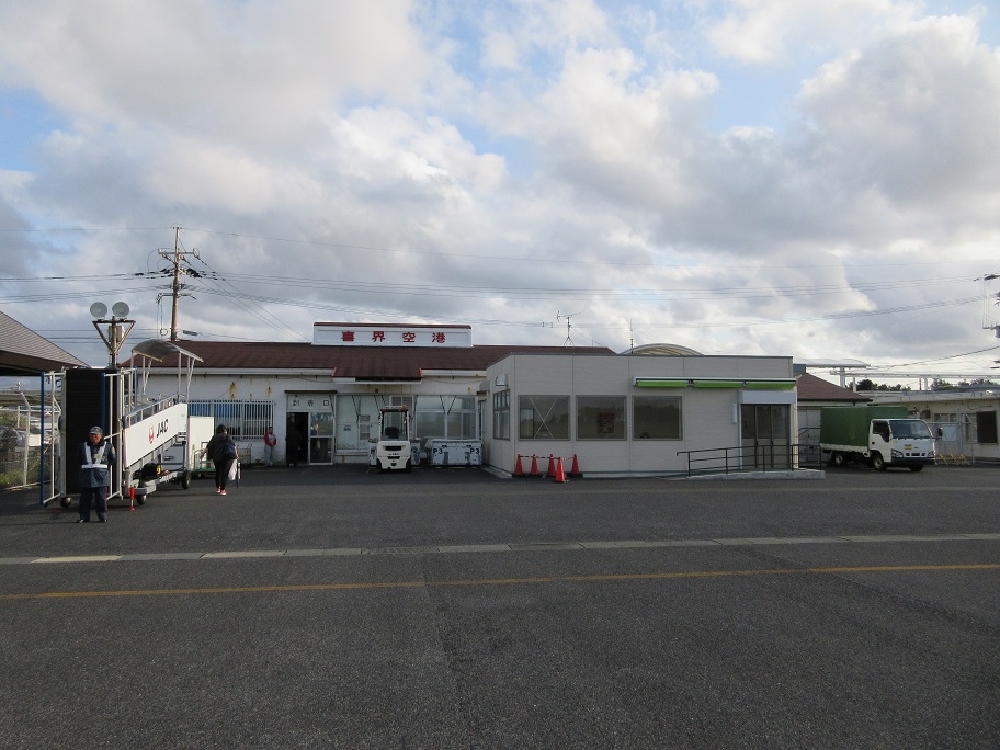 喜界島の空港です、外観は地方鉄道の駅のような感じでこじんまりとした空港です。街中に近くてアクセス面はいいです。空港内には食堂が1軒あります。航空会社の手続きカウンターは自動チェックイン機などはなく全てカウンターで行います。