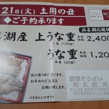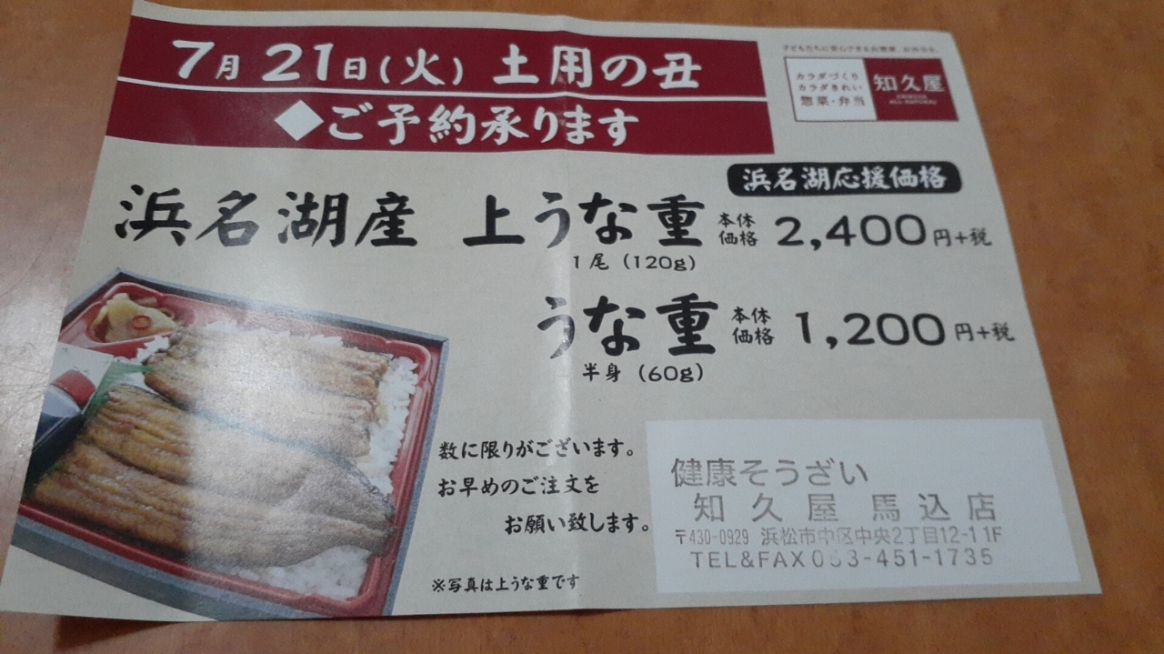 また2020年7月21日の土用の丑にちなみ、浜名湖産うなぎのうな重の予約を受け付けているそうで、1尾まるまる使用した上うな重で税抜2,400円、半身を使用したものではなんと!1,200円と結構お値打ちかと思います。