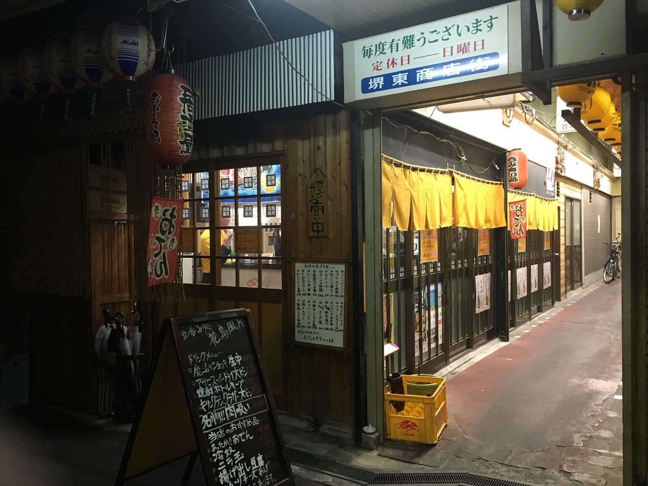 堺東駅前にある堺東商店街にある居酒屋です。堺出張で寄りました。店内は狭く、立ち飲みとありますが、カウンターにはイスもあり、みな座って飲んでいます。料理の種類は多くありませんが、おつまみは揃ってます。朝の10時オープンとはさすが大阪です。