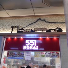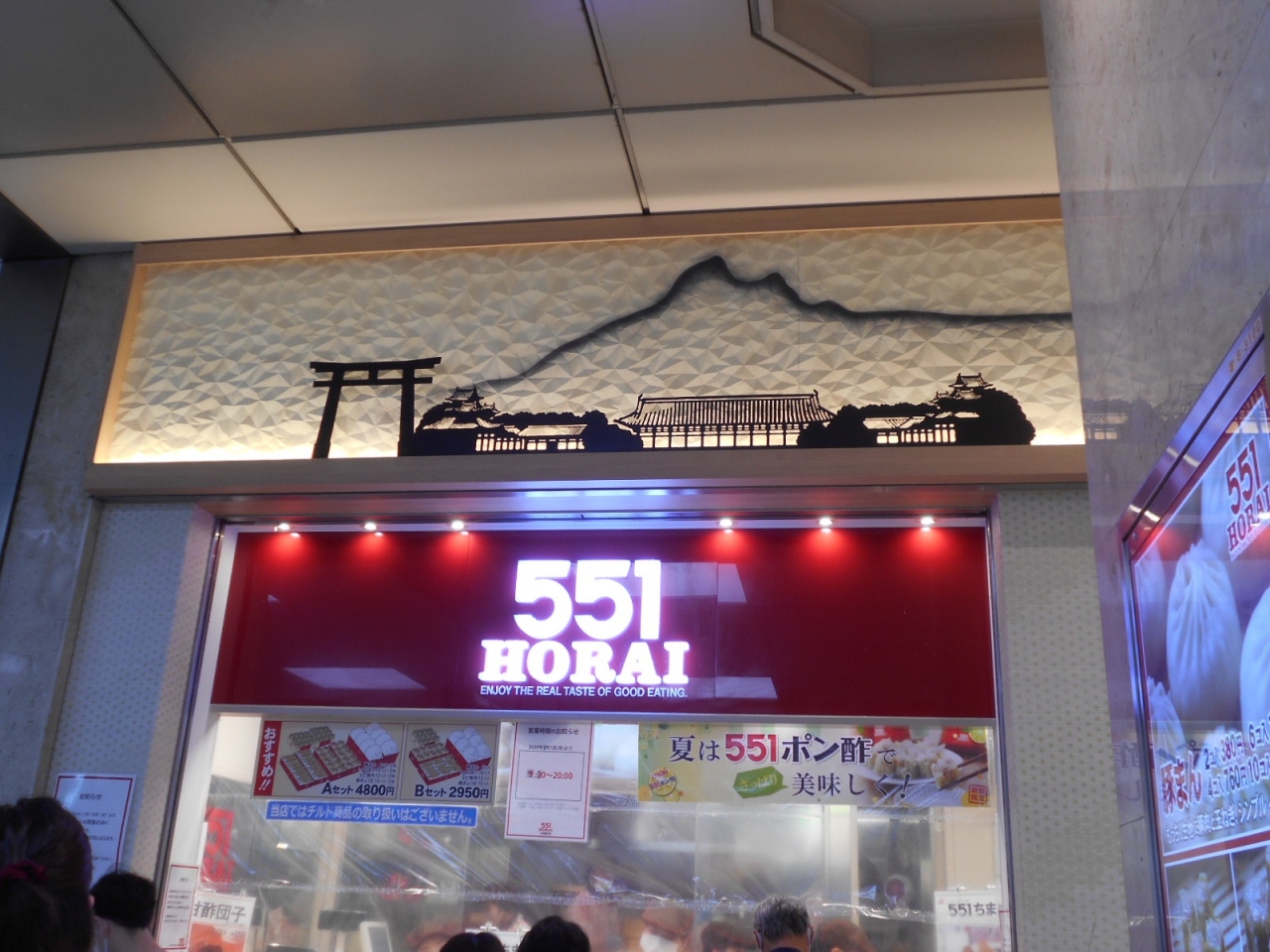 JR京都駅の駅なかに551のお店があります。お客さんの列ができ、にぎわっています。京都らしく。看板の上に京都らしい模様が施されていたのが印象的でした。京都でもできたての豚まんや餃子、しゅうまいなどが買えるのはありがたいです。
