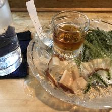 沖縄にきたら定番の「海ぶどう」をおつまみに、泡盛「久米島」を味わいます。