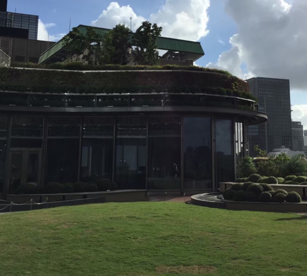 おしゃれな商業施設でカフェやレストランやショップの他にオフィスフロアもあるそうですが、今回は空中庭園で一息つきにいきました。雨がザッと降った後の晴れ間だったからかタイミングよくたまたま人が少なくて、ベンチを拭き拭き座れたし、緑がとても気持ち良かったです。