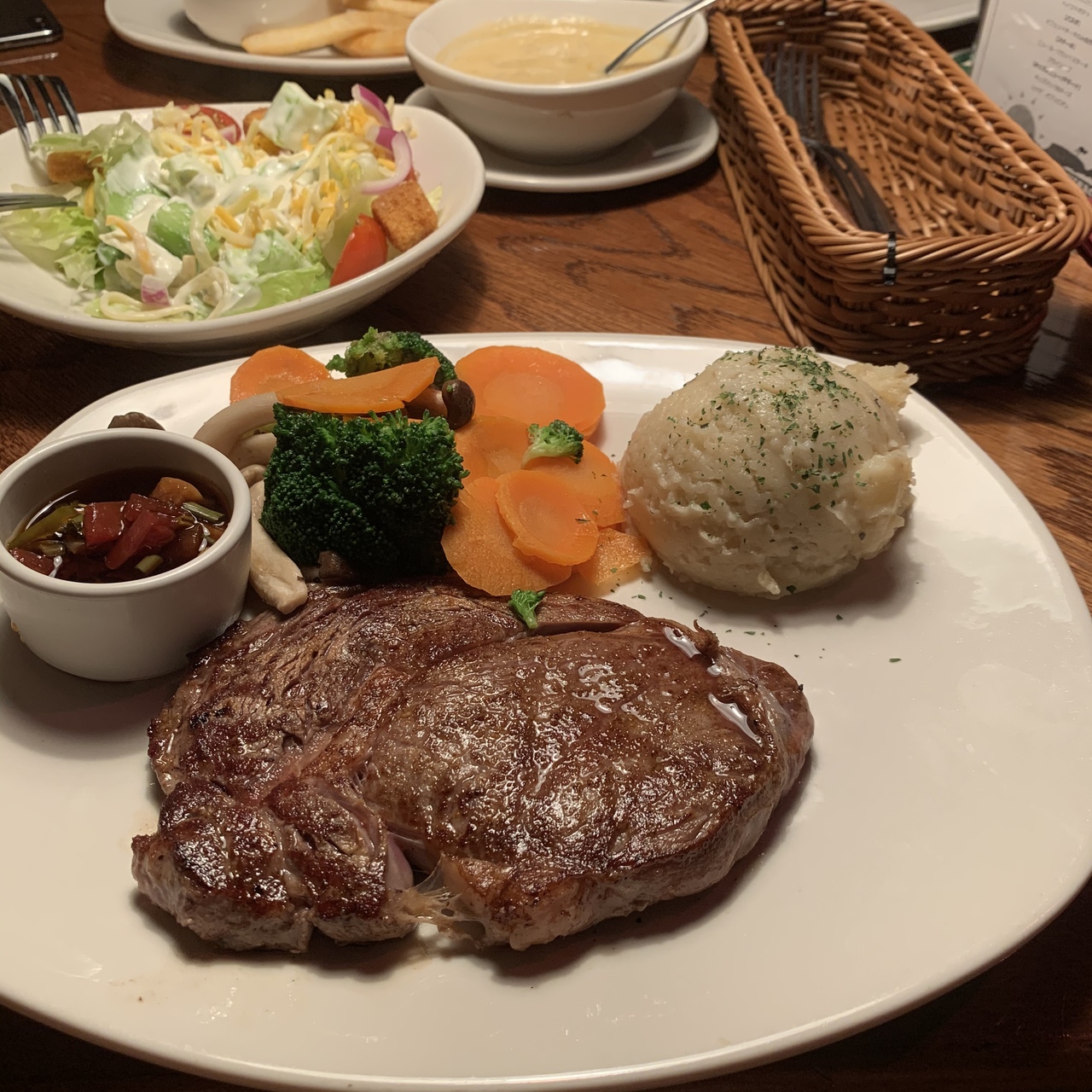 リブアイステーキを注文しました。セットでついてくるサイドメニューやサラダまで、とにかく量が多いです。ソフトドリンクは400円でお代わり自由なのは嬉しい。