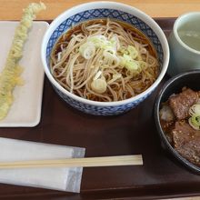冷がけそば普通サイズと丼で1100円。ミニサイズのそばもあるが、普通サイズでちょうどいい。