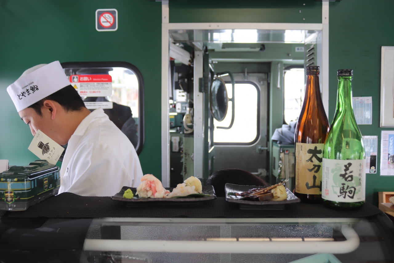 氷見線と城端線を走る観光列車です。1両しかないので、土日で交互に運転されています。最大の特徴は車内で富山湾の寿司がいただけること。寿司職人が乗車し、その場でに握ります。氷見線では雨晴海岸の富山湾を眺めることができます。