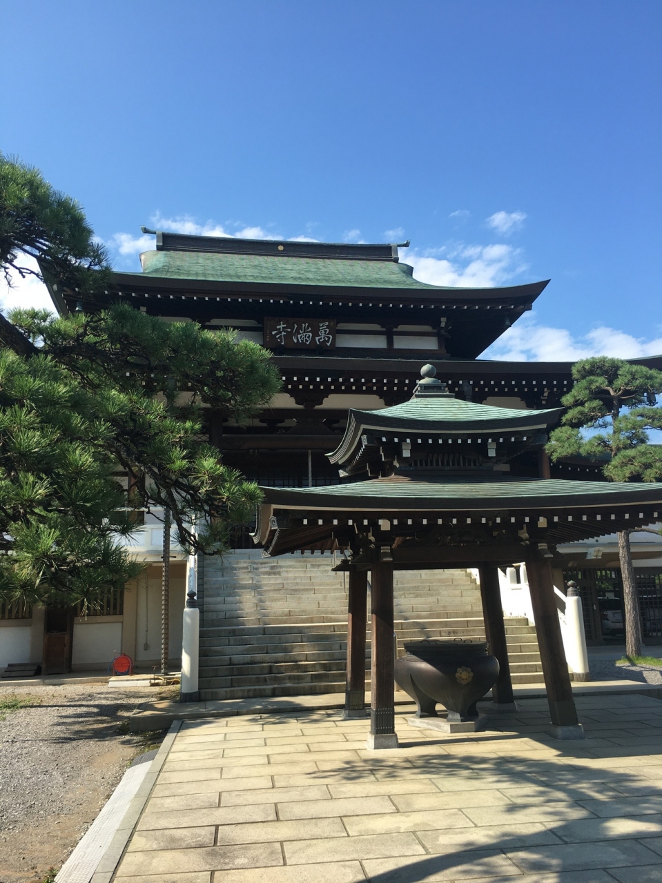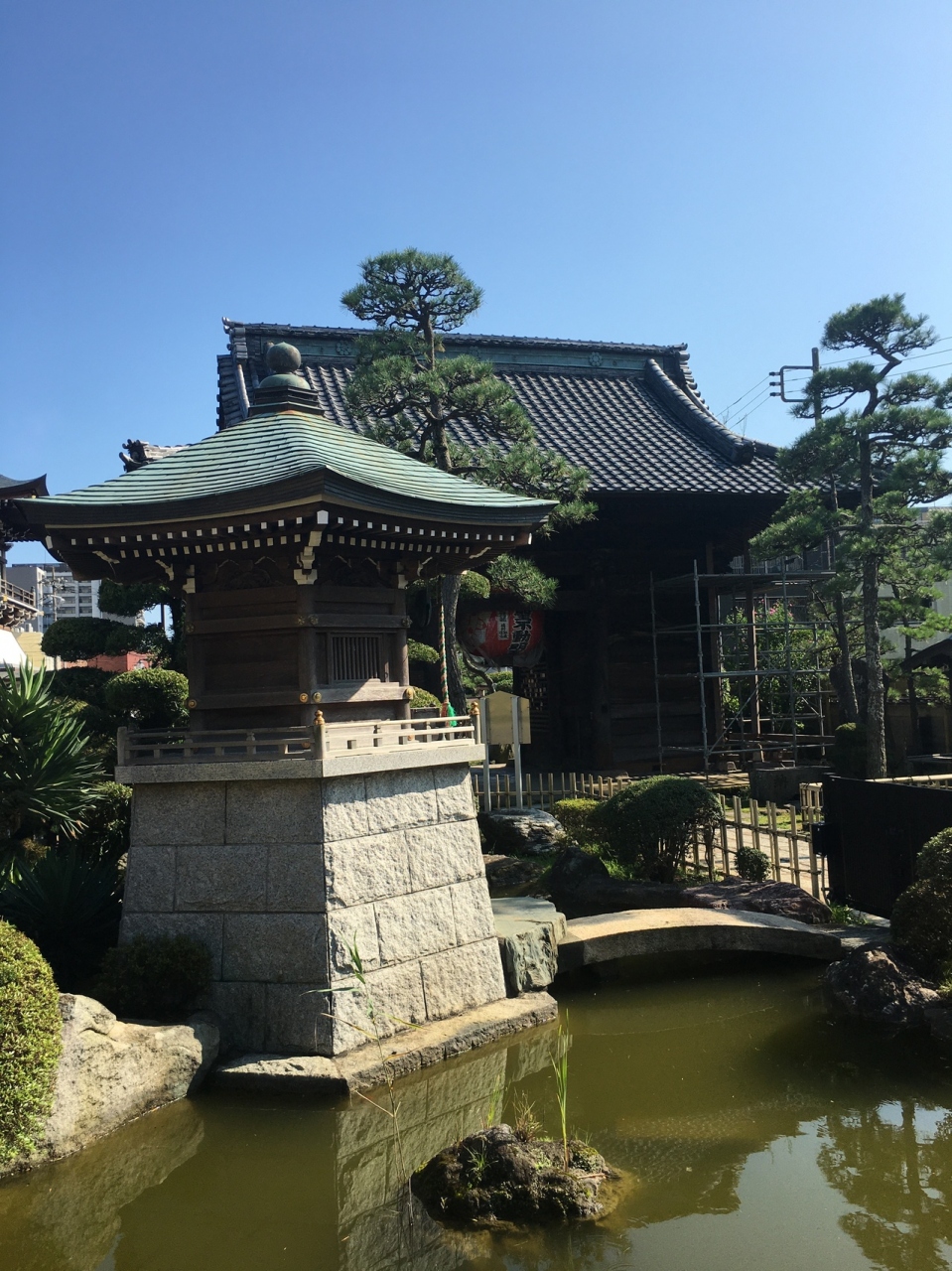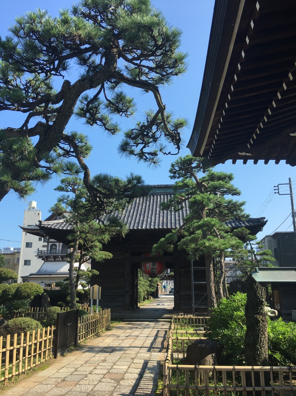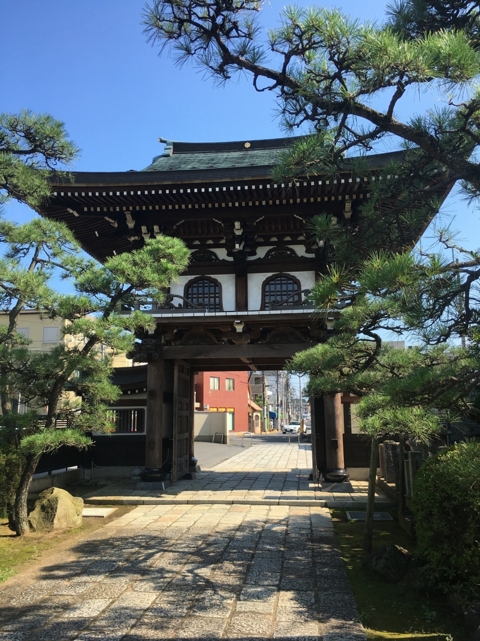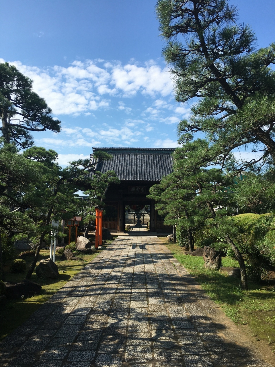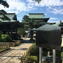 道路の正面に山門があり、道路が右に逸れていました。山門の屋根が大きく、潜ると再び門があり途中に鳥居、松、石等が綺麗に並んでいました。本殿の手前に池がありミニ庭園になっていました。松がたくさんあり上伸びているのではなく曲がって伸びているのが多かったです。