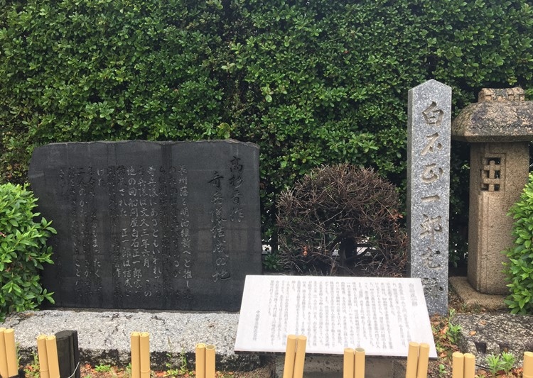 宿泊したホテル、ウイングインターナショナルの筋向かいに説明板がありました。荷受問屋で富を築いた豪商、白石正一郎の屋敷跡です。一郎は高杉晋作らの維新の志士を支援していて、高杉は文久3年(1863年)、この地で奇兵隊を結成しています。