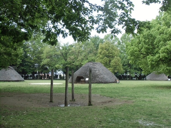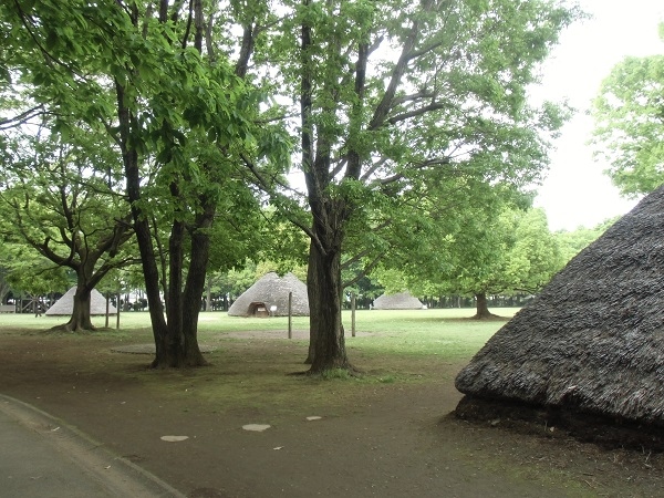 広い芝生公園には5つの竪穴住居が再現され、展示館や資料館もあります。