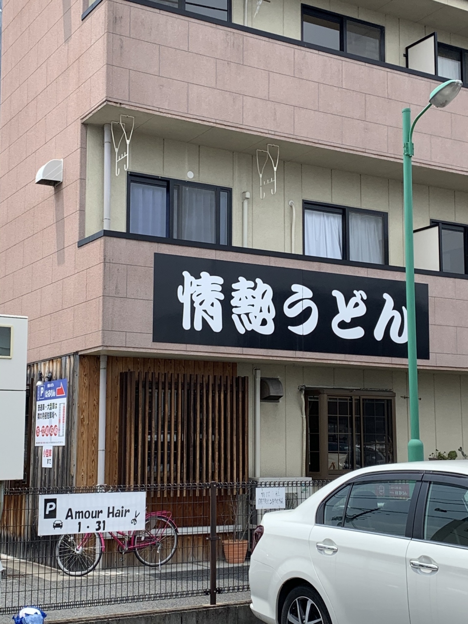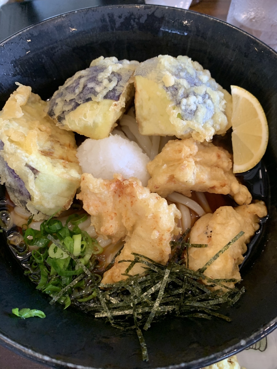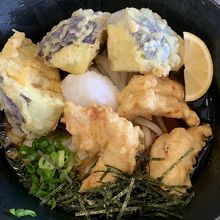おうどんは驚くほど腰がありシコシコ、とり天3個、丸なす天3個は大きくボリュウームたっぷり。