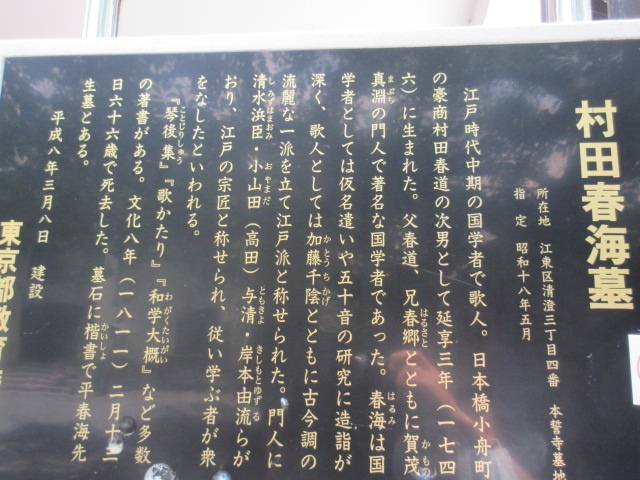 東京の清澄白河の散策で発見したお墓です。江戸時代に星加の問屋さんに生まれた、国学者のお墓だそうです。歌人としても有名で、門人もたくさんいた有名人だったそうですが、今回調べて初めて知りました。本誓寺というところにあって、説明板もあるのでわかりやすいですが、特に目立つ感じではないかな。ちょっと白っぽいお墓でした。