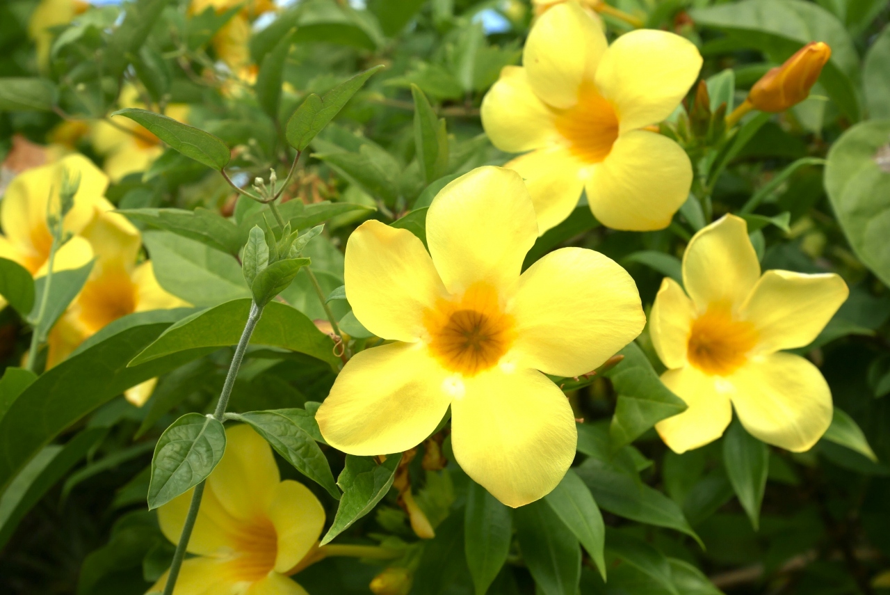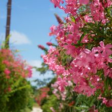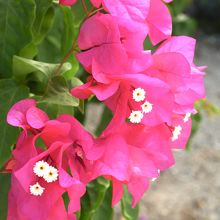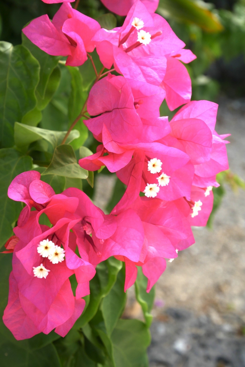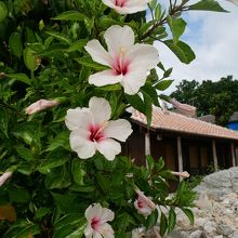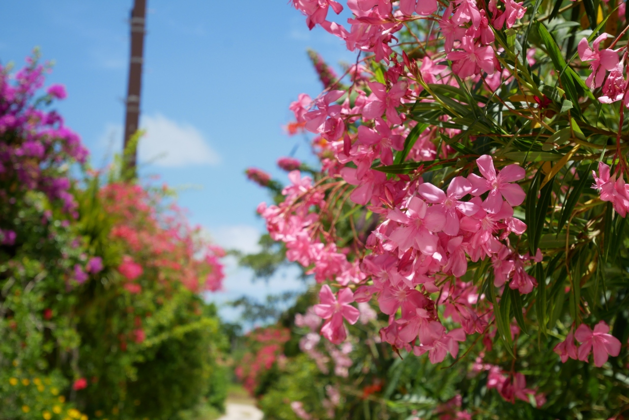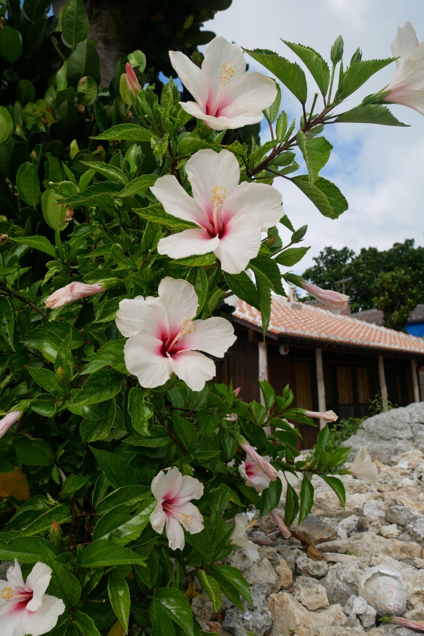 赤瓦の昔ながらの島風景と、ブーゲンビリアをはじめ花咲き乱れる島