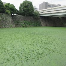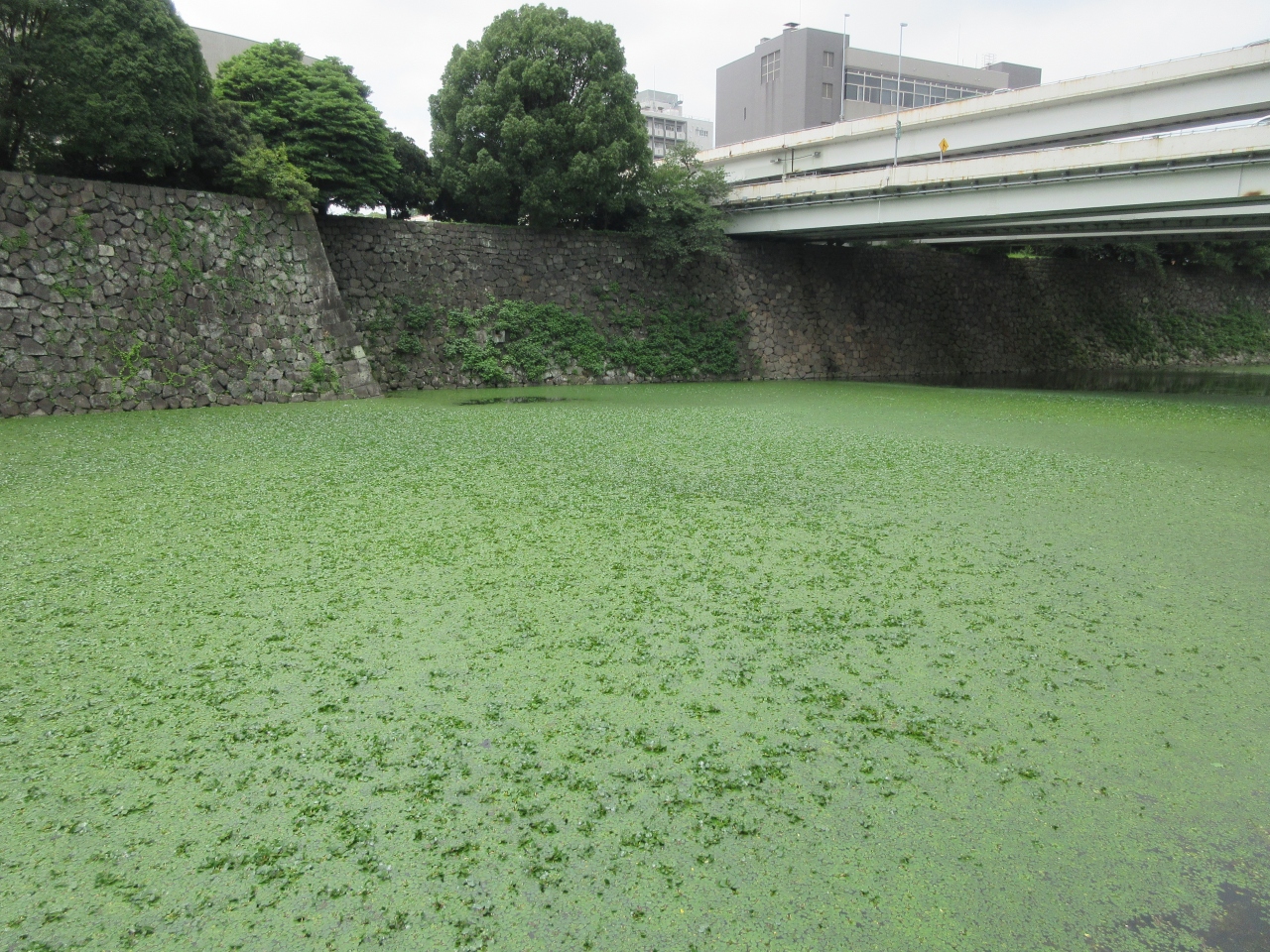 江戸城に造られた12の濠の1つで、清水門と竹橋の間に造られた広い濠です。濠沿いには石垣が築かれ、北の丸公園に向かう清水門橋と清水門が造られ、城らしさが感じられます。濠には水面が見られないほど水草が生い茂っていました。隣の牛ケ淵にも蓮が大きな葉をひろげ、ピンク色の花が咲き始めていましたが、清水濠の水草は小さな葉で花が咲きそうな様子は見られませんでした。