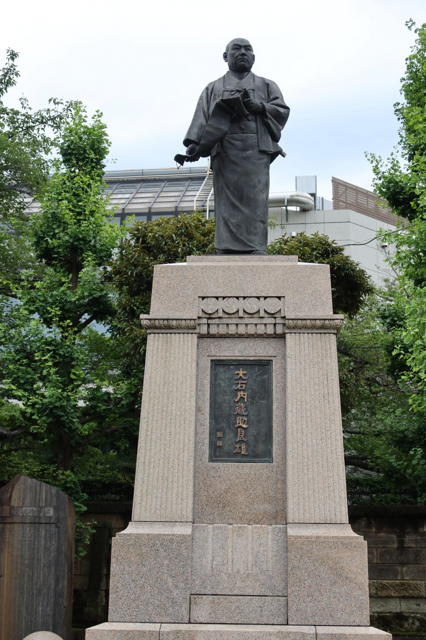 泉岳寺の中門を潜り、土産物店の前を抜けた山門手前の右手に大きな大石内蔵助の銅像が建てられています。桃中軒雲右衛門の発願によって作られた銅像で、新しそうですが、大正時代の物です。大石内蔵助のの実直な姿を現した姿はとても凛々しく感じました。