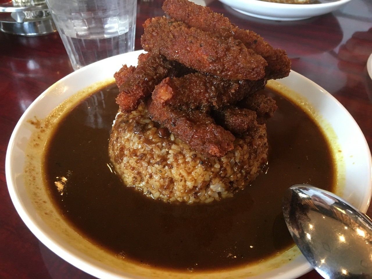 看板メニューのひとつ、マウンテンチキンカツカレーをいただきました。量や辛さは選べます。スパイシーなカレーの海の中央にライスの島。島には一口サイズのチキンカツが櫓のように載っています。美味しいですが、食べ進むうちに飽きてきます。