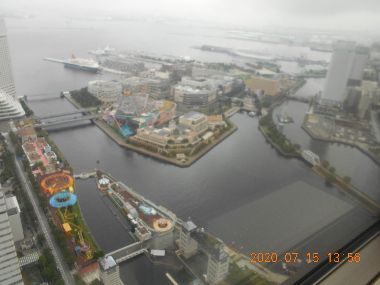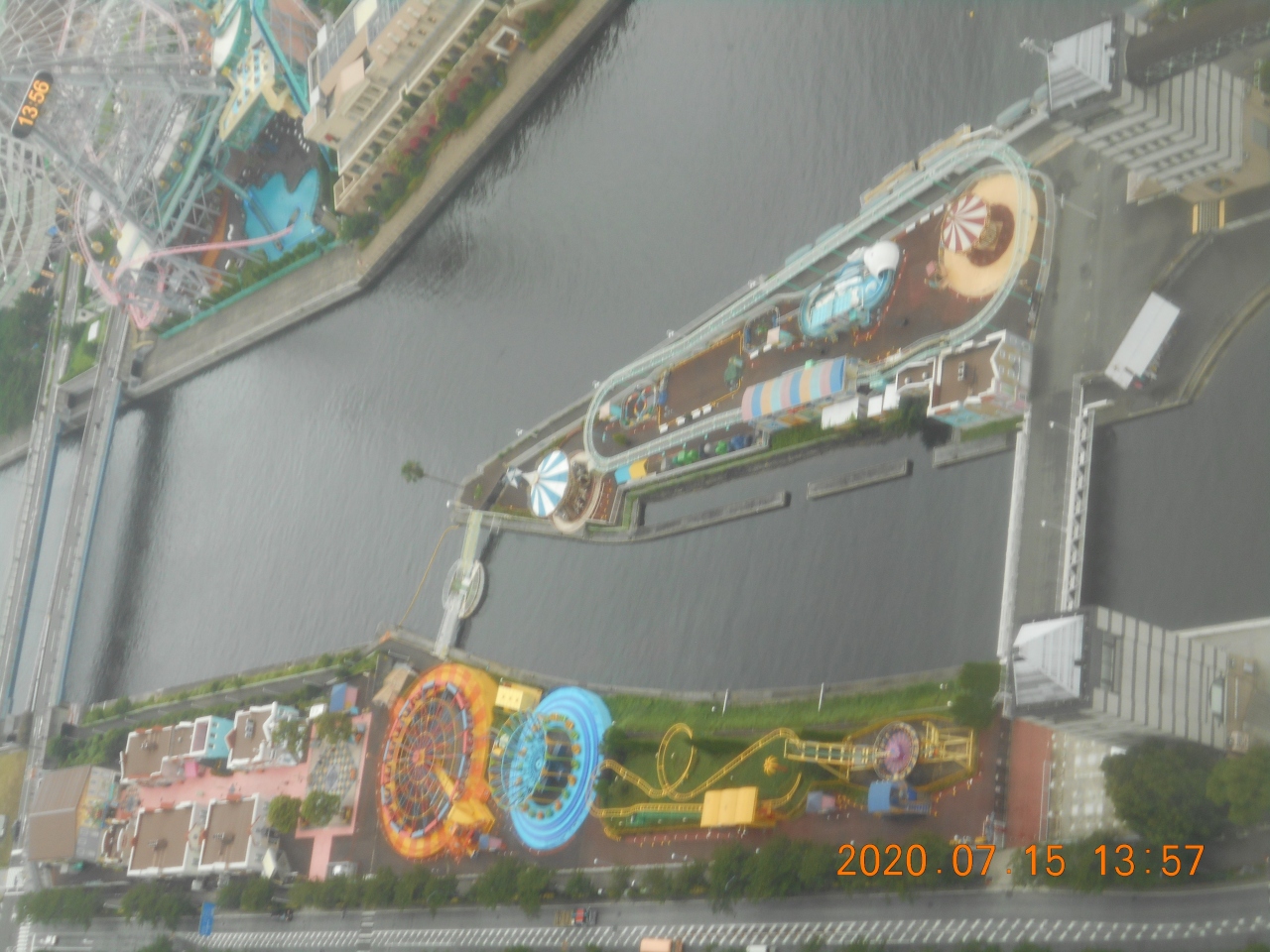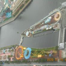 初めて高層階からの景色を見ましたが、見慣れている景色もいつもとは違った雰囲気でした。お天気が良ければもっと美しい空や海の色が見えただろうと思い、少し残念ですが真下に見えるコスモワールドのカラフルさは雨の中でもよく目立っていました。