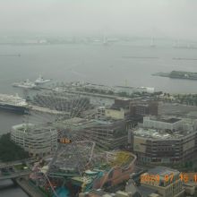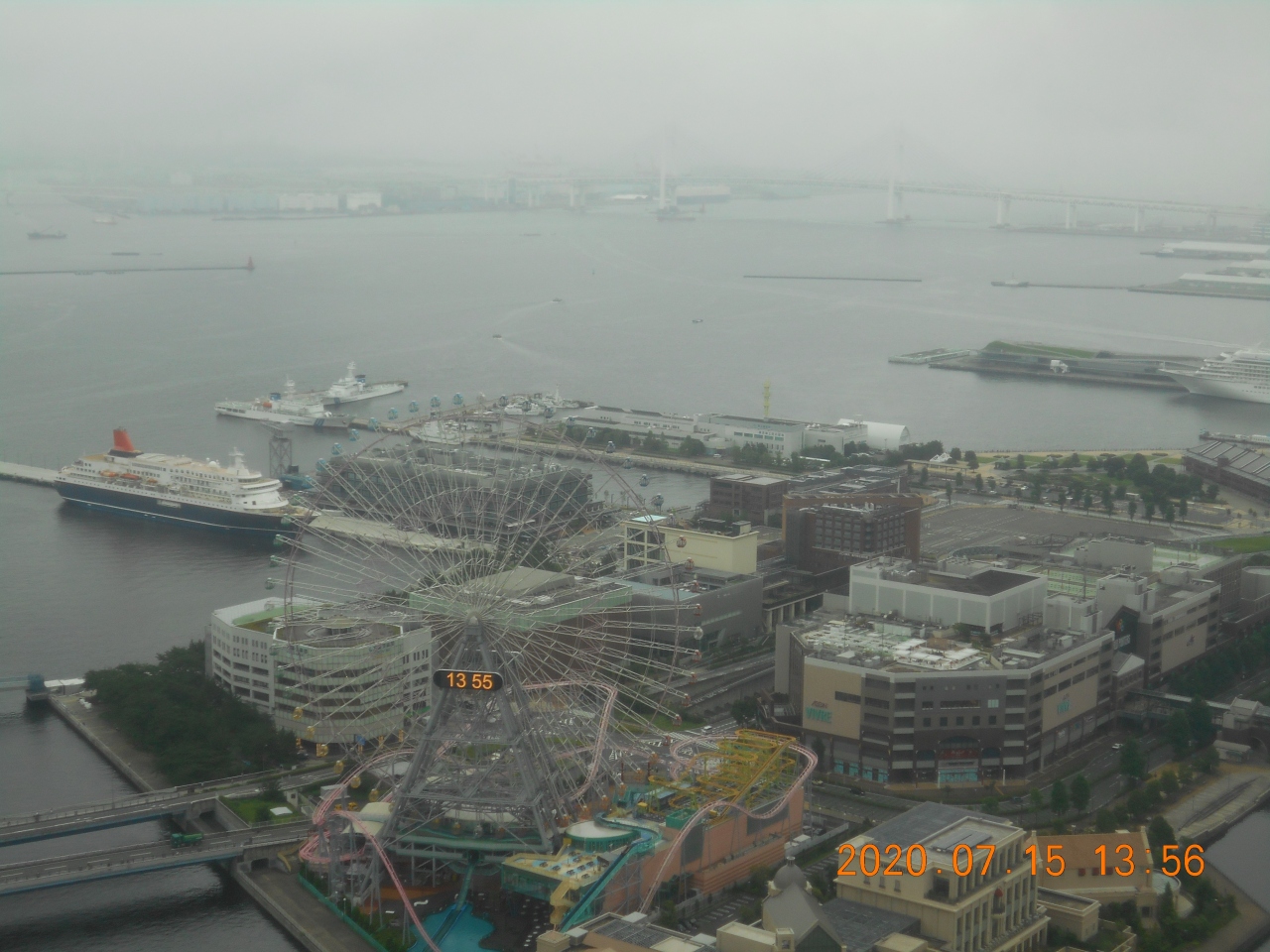 いつもは見上げている時刻表示の電光板を上から眺めるとこんな感じになるんだと改めて思う光景です。いくつかの建物がコスモクロックの編み目の向こうに透けて見える感じも新鮮で、地上から見る景色とは全く違っていました。