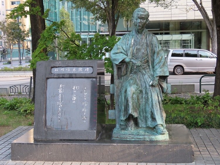 日本各地至るところに歌碑がある流浪の天才歌人・石川啄木。存命中に名を成すことはできなかったのでよけいに悲劇性じゅうぶん。北海道各地を放浪したことを回想したたくさんの短歌が収められた第一歌集「一握の砂」は、さしずめご当地ソングでしょうか。札幌の大通公園にはこうしたモニュメントを配置するスペースがたくさんありますが、腰かけて右ひじをついているポーズは作者がよく工夫したものだと思います。