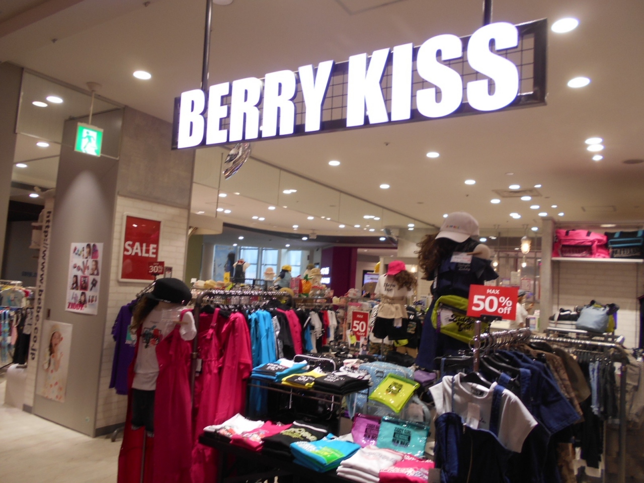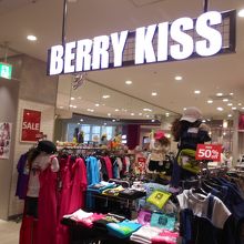 ベリーキッスは、イオンモール茨木の中にあるキッズの女の子向けファッションのお店です。べべのブランドの一つです。かっこよくかわいい色合い、デザインの洋服がたくさん並んでいました。女の子は小さいうちから好みがありそうですね。