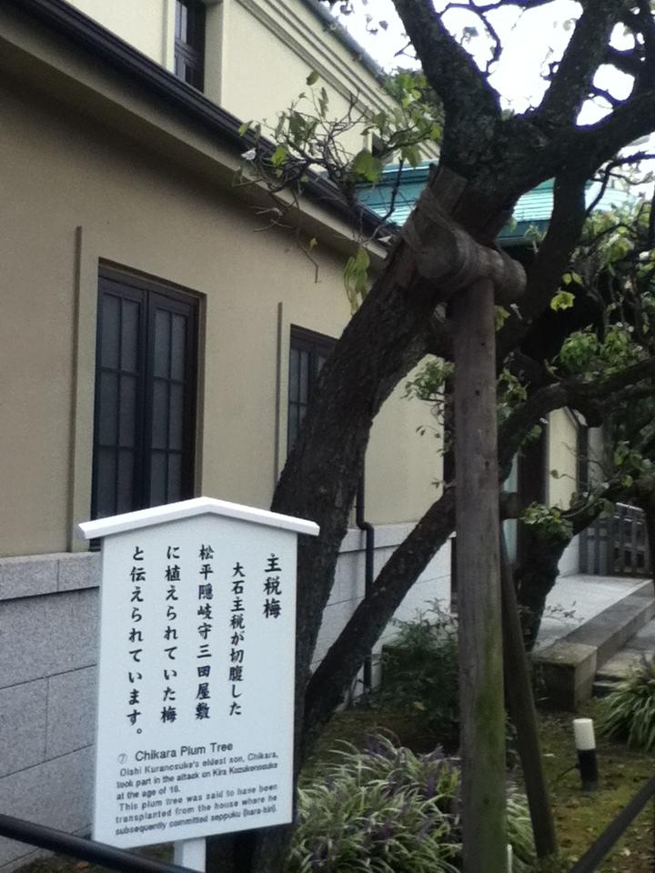 泉岳寺 主税梅は本堂の手前左側にある。お勧めの点は、この梅の木は三田の松平壱岐守邸に植えられていたものでここに移植されたこと、三田の松平壱岐守邸は赤穂浪士の一人、大石主税が切腹した処であることである。訪問時の感想は、主税梅はかなりの年数を経ているがいまでもしっかりと立っている。この主税梅をじっくり見たり大石主税はじめ赤穂浪士について理解を深めることができ訪問して良かった。