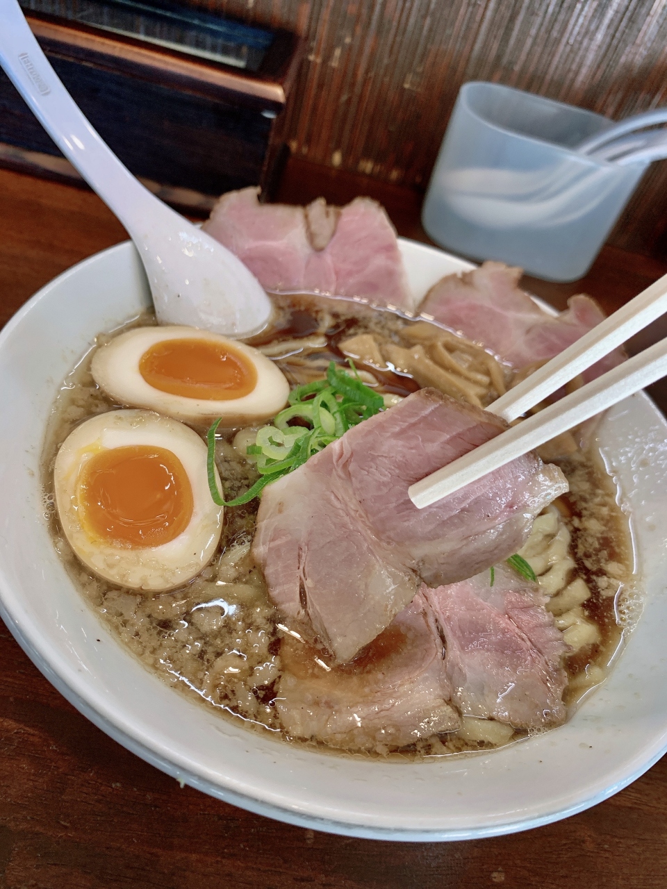 具材は厚切り「レアチャーシュー」「メンマ」「煮卵」「青ネギ」です!特製にすると結構なボリュームですね~女性は完食できるのかな?