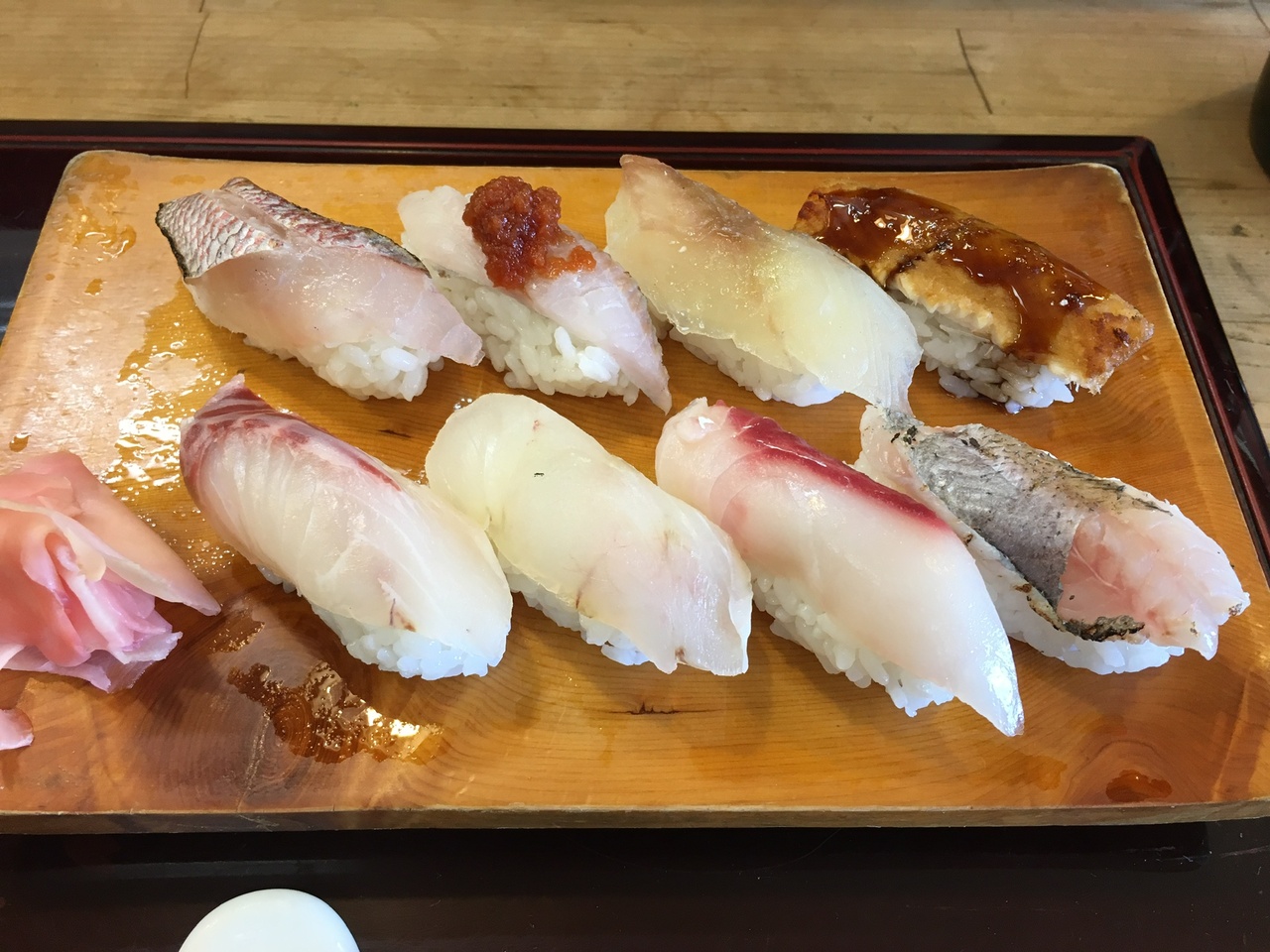 由比駅前の桜えび通り沿いにある寿司屋。店内はカウンターと小上がりの座敷があります。ランチで地魚のにぎりをいただきました。白身魚が中心です。地元の桜えびは春秋の漁期のみですが最近は不漁だそうで、入っていませんでした。
