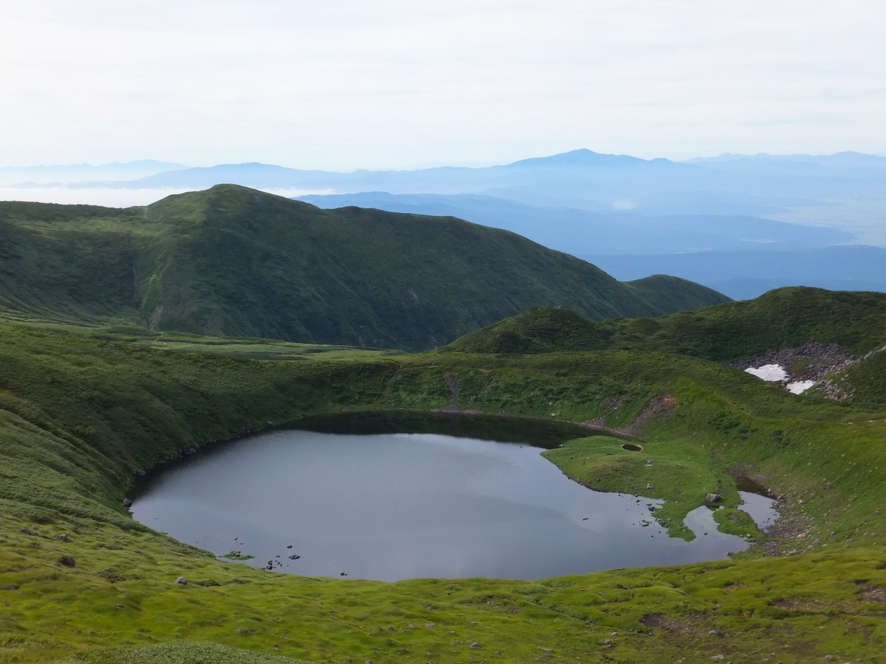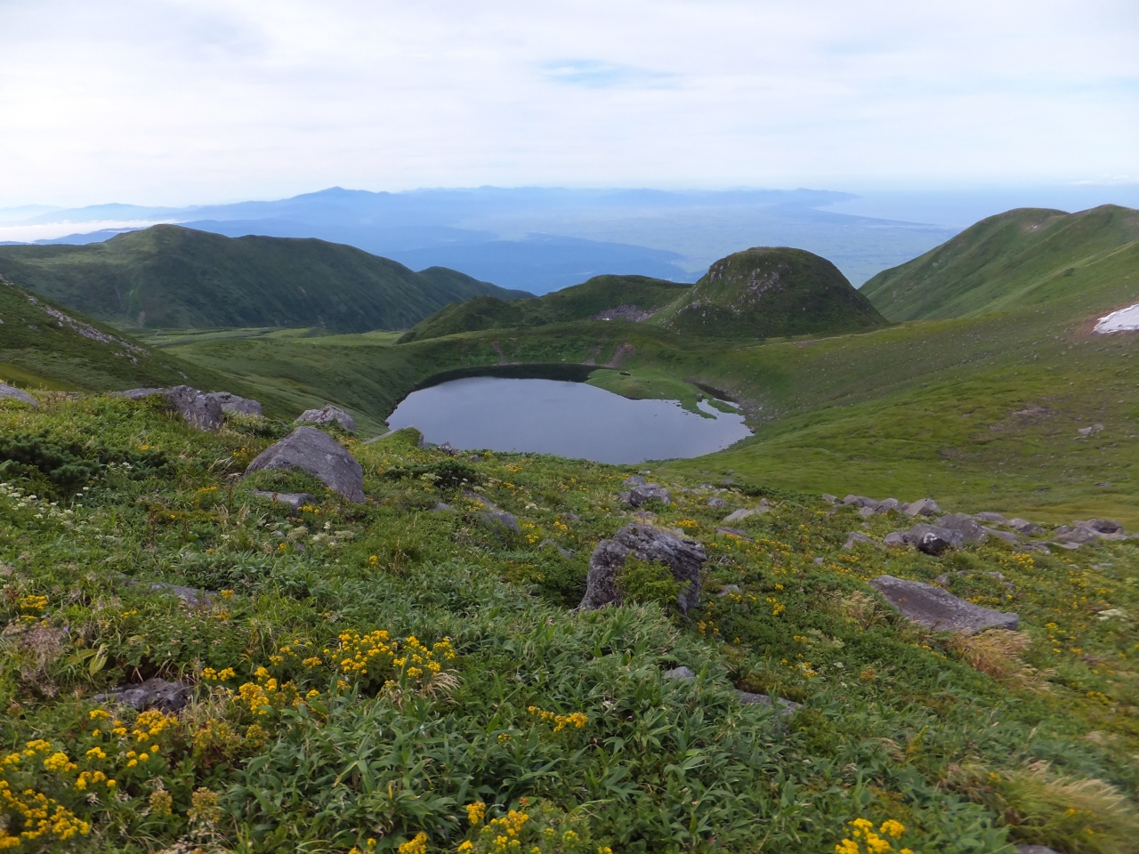 鉾立ルートを歩いていると現れる湖です。湖と言うよりも水たまりに近い印象です。酸性が強くあまり生物はいないが、クロサンショウウオなどが生息しているそうです。高山植物が咲き、高い方から眺めると、遠く月山や日本海も視界に入るので恰好の撮影スポットとなっています。