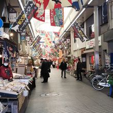 港町の商店街らしく、大漁旗が装飾に用いられていて活気を演出。色々な店がありますが、やはりメインは魚屋。新鮮な魚が並びます。生鮮品以外にも干したたこや佃煮のような加工品もあったので、お土産目的でも行かれるといいと思います。