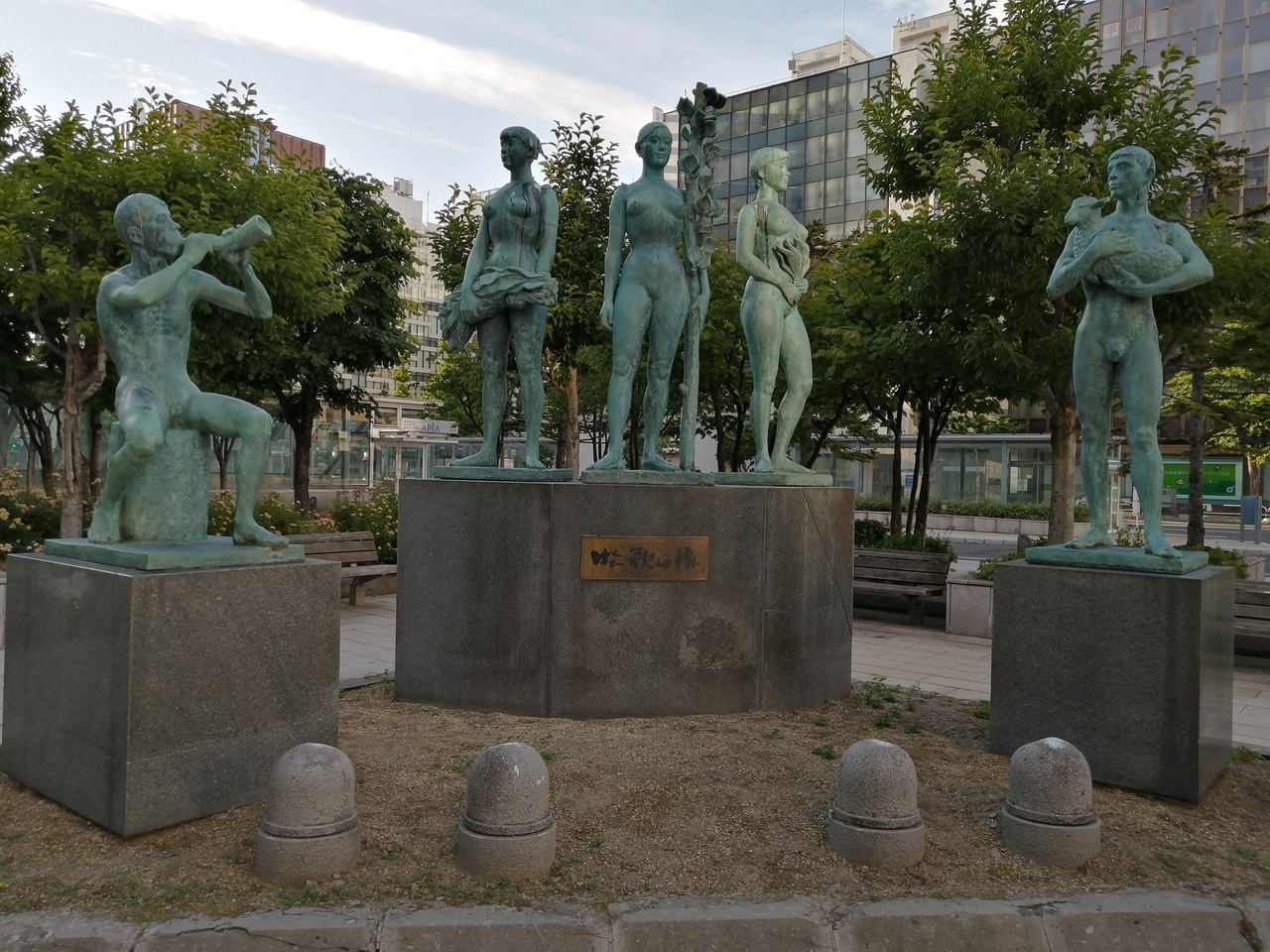 北海道出身の本郷新さんの作品です。札幌駅南口のタクシー乗り場の比較的近くにあります。人の銅像が5体程度のセットなので、目立っています。寒い時期でなければ、待ち合わせ場所に良いのではないかなと思います。