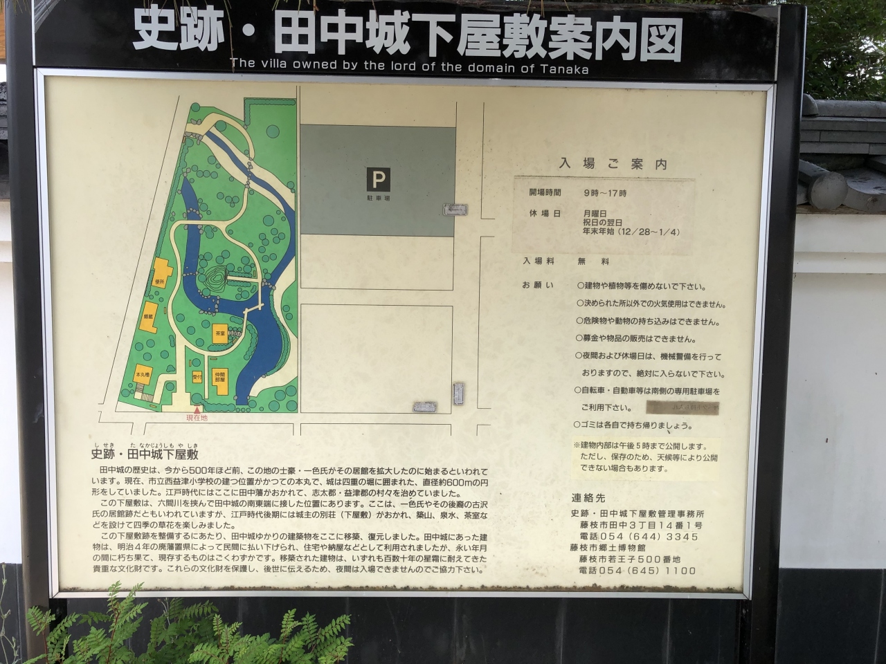 約500年前にこの地の豪族、一色氏が駿府・今川氏の命により屋敷を拡大して築城されたのが田中城の始まりと言われています。その下屋敷が史跡として整備され復元されています。城本丸櫓も移築保存され、内部が公開されています。入場無料で、駐車場も用意されています。