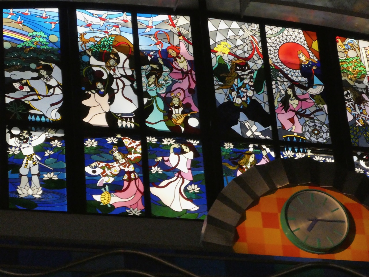 2019年5月15日。宮崎空港にステンドグラスができました。中の吹き抜けの正面。屋根がガラスドームになっている妻部分、てっぺんの三日月型の部分です。ちょっと高さ方向が狭いですが、宮崎は天孫降臨の神話の国であることから、影絵作家の藤城さんという方のデザインで、神話のストーリーがはめ込まれてます。3階の駐車場側正面、エアポートギャラリーに「ステンドグラス見学タッチパネル」があって、どこの部分がどんな神話なのかを見ることができます。