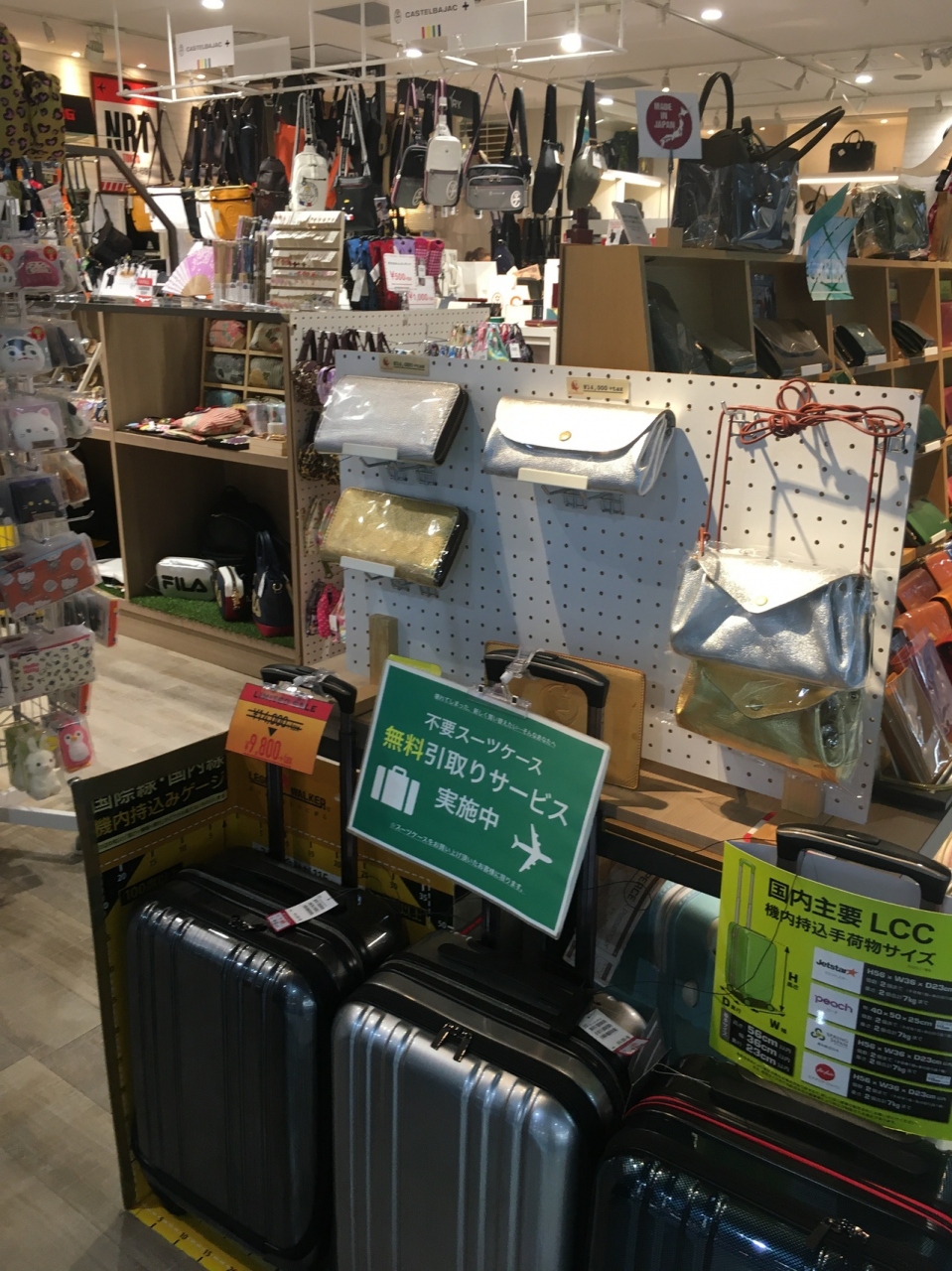 チェックインカウンターに向かうカーブする場所にあり、通路沿いなのでドアの敷居はなく、かばんがたくさん並んでいました。スーツケースは前面に配置され横には財布がたくさん置いてありました。不要のスーツケースを無料で引き取ってくれるサービスを実施していました。