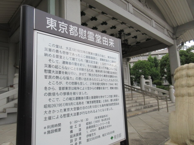 両国の横網町公園に徒歩でアクセスしました。その公園の中にある施設です。銅ぶきの屋根のとても大きく立派な建物です。中に入ることもできました。中には写真や絵なども展示されていました。関東大震災での御遺骨を納める霊堂で、祈りの場所でした。