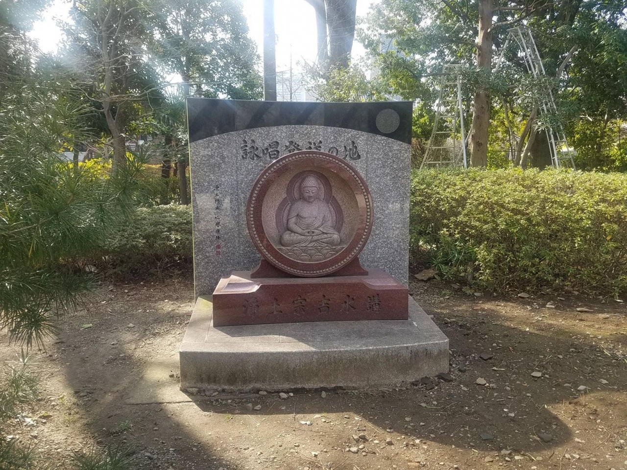 三解脱門を入って左手、魚供養之碑の近くにあります。座禅を組んだ小さい大仏みたいなのが立体的に表現されていて他ではなかなか見ない石碑です。詠唱と聞くと古くからあるように思えますが昭和21年発祥とのことで、割と最近なのですね。