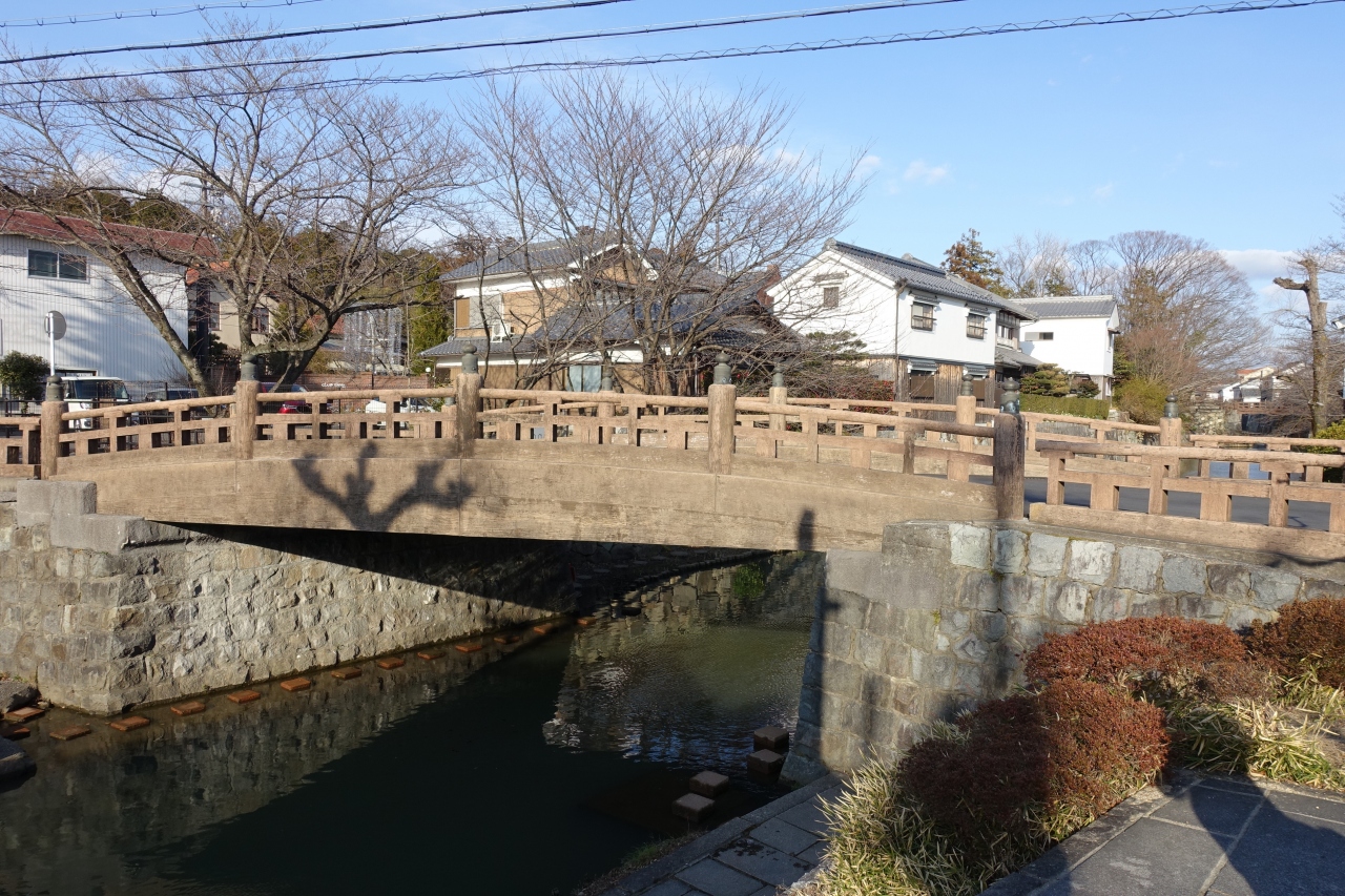 近江八幡の中心となる「新町通り」と並行して1本東側を通るのが「魚屋町通り」です。この魚屋町通りが八幡堀と交わる部分に架かるのが「明治橋」です。見ごたえある八幡堀の光景の中でも代表的なのがここではないかと思います。残念に思ったのは写真を撮ると電線が写り込んでしまうこと、是非地中化を進めて欲しいと思いました。