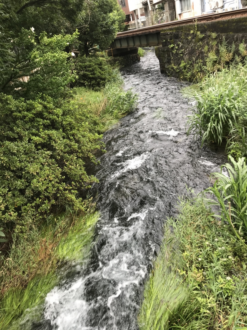 以前は汚染された川だったそうですが、現在は、きれいです。ボランティアにより、定期的な河川清掃やホタルの幼虫放流などがなされているそうです。川に沿って歩いて行くことができ、伊豆箱根鉄道の電車を目の前に見ることができたりします。せせらぎの中を歩いていけるようになっているそうですが、連日の雨で水かさが増し、怖くて歩くことはできませんでした。
