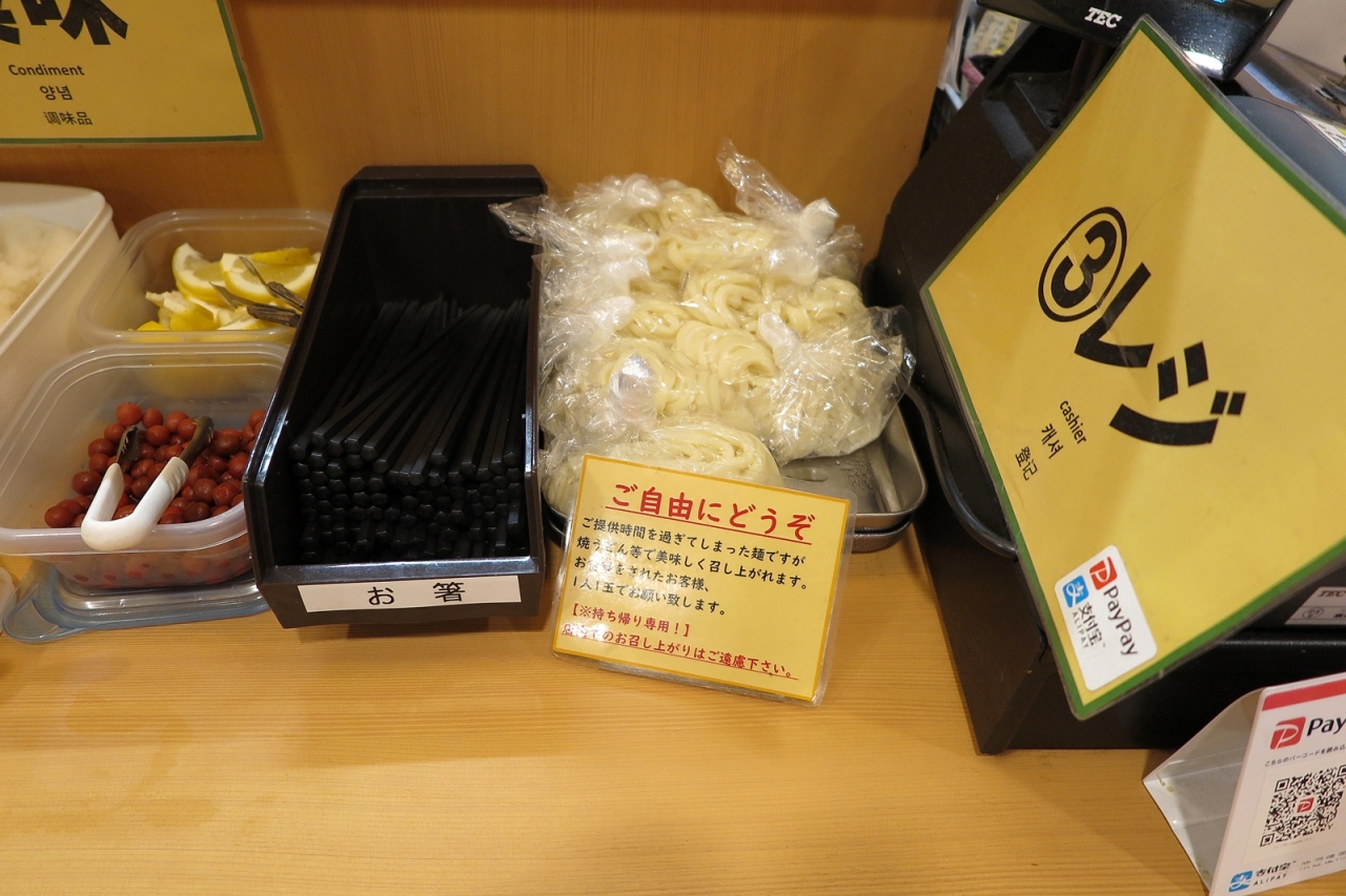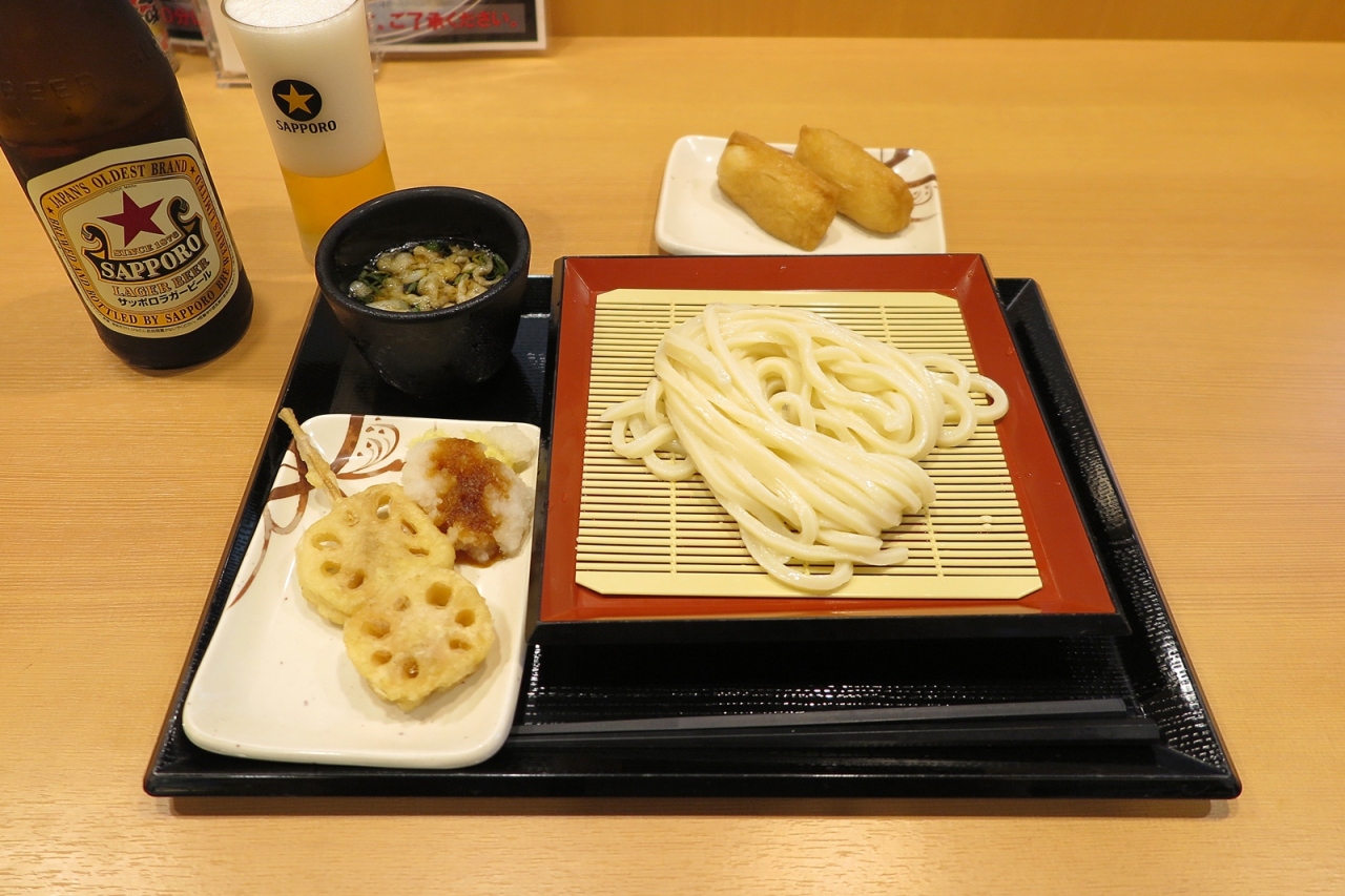 初めての高知なのに、その最初の食事場所として讃岐うどんのチェーン店に入ってしまいました。それは店頭に”骨付き鳥”とあったからです。骨付き鳥の”おや”は本場香川で経験済でしたが”ひな”は食べておらず、後悔していたのです。注文したのは瓶ビール(サッポロラガー)600円、生ビール(サッポロ黒ラベル)550円、ざるうどん(小)420円、いなり寿司70円、れんこん天ぷら110円、骨付鶏990円、おにぎり130円で、総額2940円と、セルフのうどん屋さんで豪遊しました(笑)。チェーン店でしたがうどんはもちろん、骨付き鶏も美味しいもので満足しました。ただ、有楽町にも支店があったとは…(笑)。