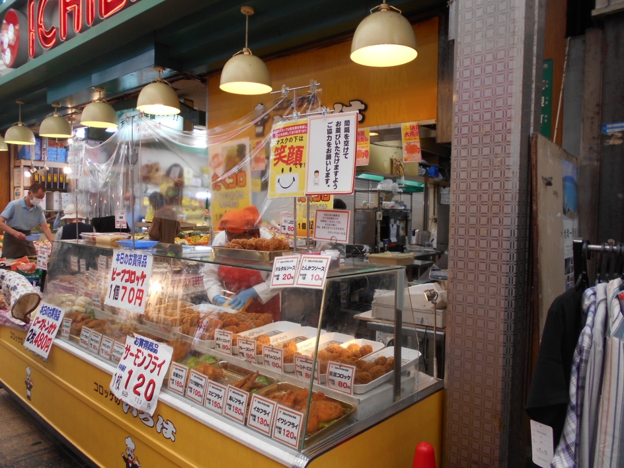 高槻センター街の中に市場があり、その入り口横にコロッケののいろはがあります。ショーケースにはコロッケ、トンカツ、サーモンフライなどのお惣菜が並んでいて、多くのお客さんが買い物しています。コロッケは特に安くてボリュームがあっておすすめです。なんでもおいしいです。