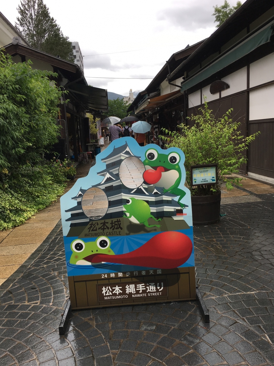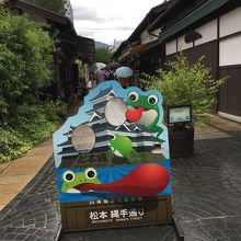 駅からお城に向かう途中、女鳥羽川の橋のふもとに鮮やかなカエルの置物が見えました、その奥がなわて通りです、賑わいはさほどでもありません。かえるの置物など、いろんな雑貨が売ってました、カフェや食事できる店もあり、風情があるのでまた訪れたいです。