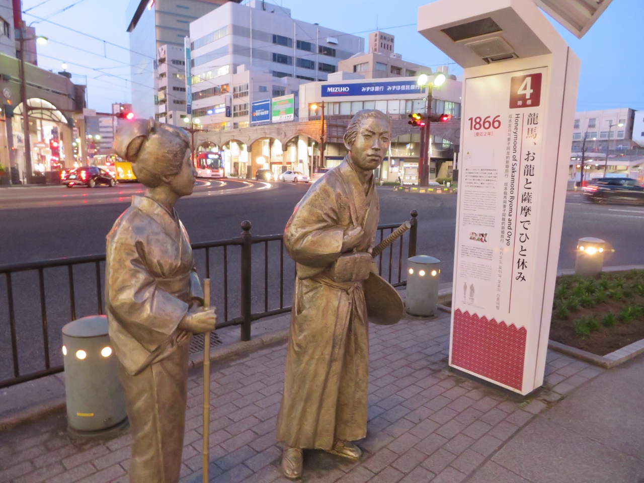 いづろ通に差し掛かった交差点の一角にある銅像で、負傷した坂本龍馬の傷を温泉で癒すために妻のおりょうと2人で薩摩を訪れた時の姿を再現しています。この時の旅は、後に日本初の新婚旅行といわれるようになったんですよね。