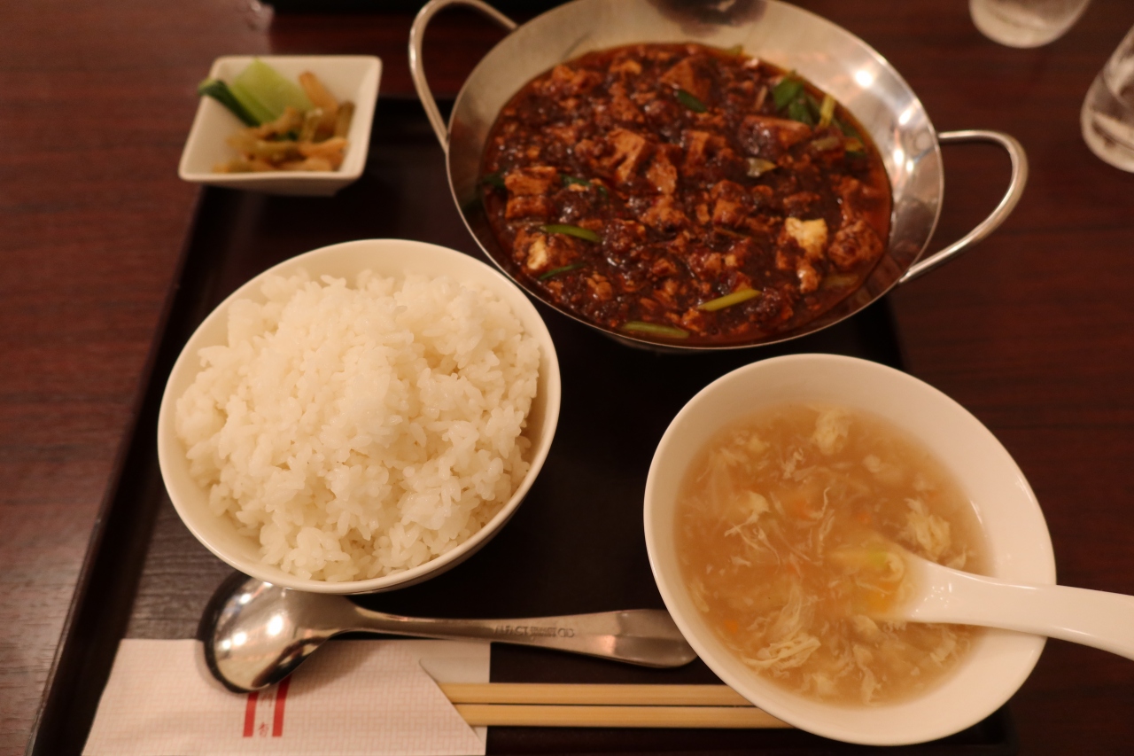頂いたのは名物の麻婆豆腐セット。麻婆豆腐にスープ、ライス、漬物が付いて1400円。麻婆豆腐は花椒がたっぷりと効き、ピリリとした辛さが病みつきになりそう。ご飯が進みます。また、上野に行ったら行きたいと思う店でした。
