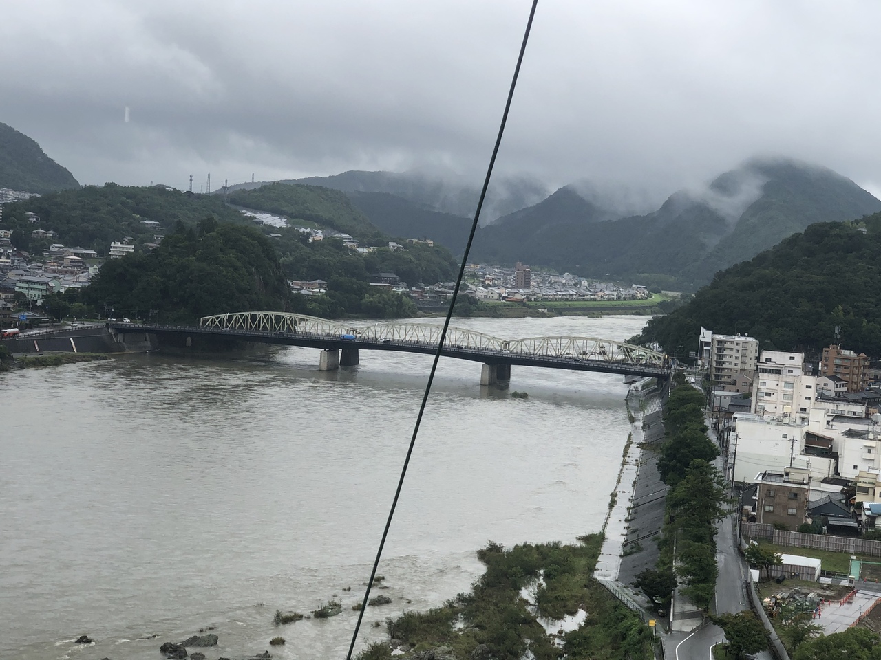 犬山遊園駅から犬山城に行く時、木曽川沿いを歩いていきました。岐阜県と愛知県の県境を流れる川です。犬山城の天守閣から眺めると、岐阜県側の街などがみえました。上流でかなり雨が降っていたようで、川が茶色に濁っていて、水量が多かったです。
