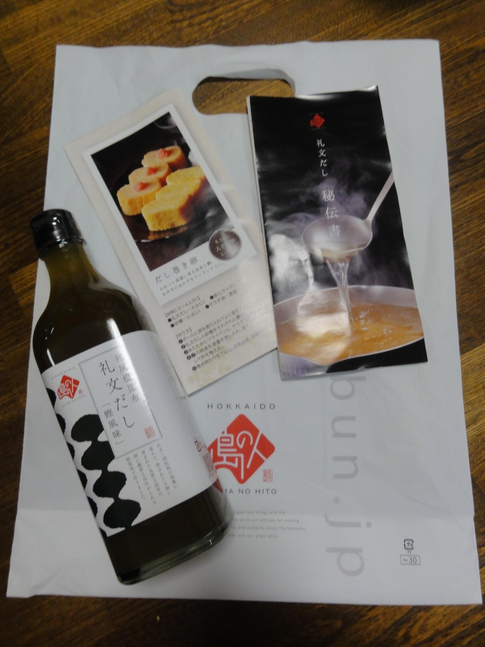 どさんこ産直市場にあった礼文・利尻の食材加工品中心のお店です。利尻根昆布エキスに鰹風味をつけた「礼文だし」を購入しました。最近、私の周辺で昆布だしが大流行、探すと色々な昆布だしがあることも知りました。サイズは150mlと500mlの2種類あり、麺類のかけ汁、出し巻き卵、みそ汁等、通常のだしと同じように使えます。
